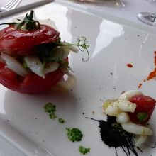 @前菜:イカのマリネを詰め込んだトマト イカ墨ソースを添えて