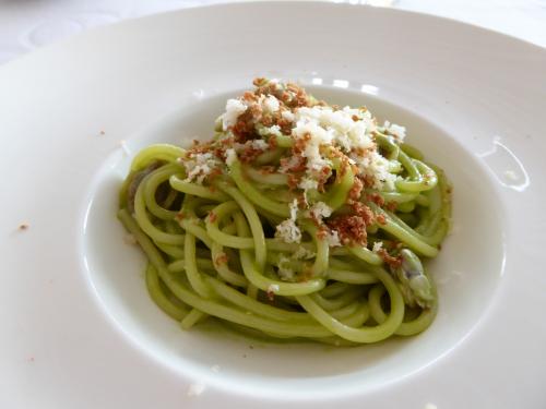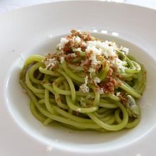 @パスタ:ピスタチオのボンゴレスパゲティ バルミジャーノチーズと炒ったパルマ生ハムを散らして