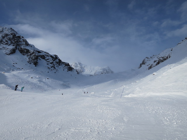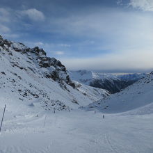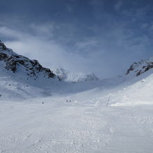 ゲレンデトップから下ってくるVal della Miteコースの中腹からみえるRifugio Vioz 3,535mと、その手前にある切り立った岩山との合わせ景色が非常恰好良い。