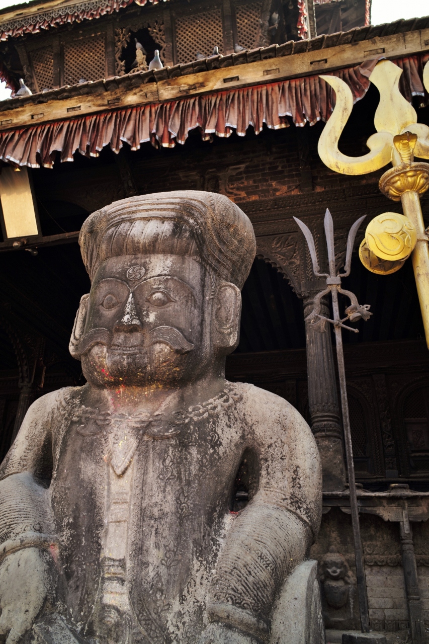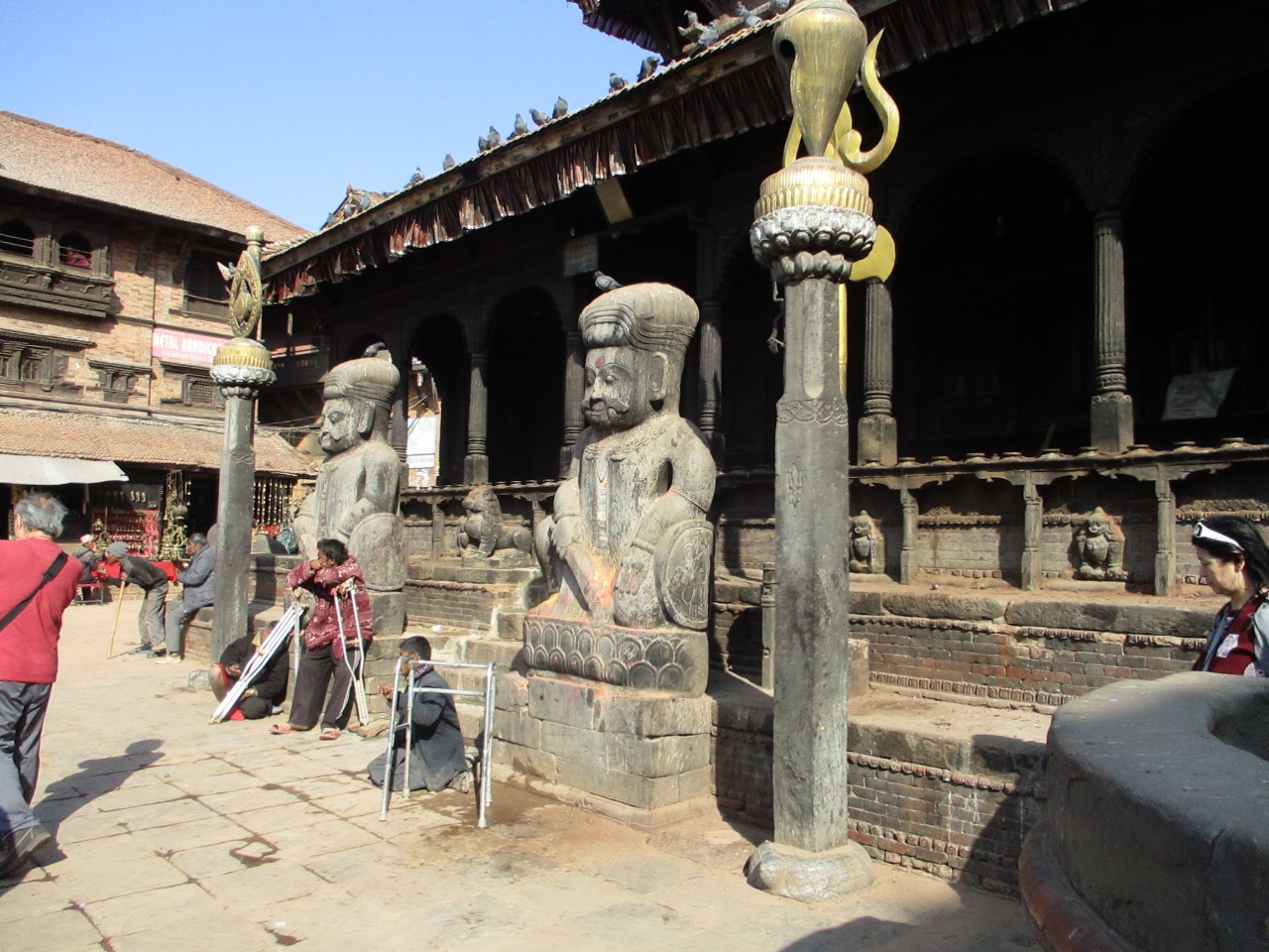 ダッタトラヤ寺院... 続きを読むは広場の東側にあり、三層の屋根からなる建物で、地震の影響はそれほど感じられず、入り口には二体の大きな伝説の戦士のジャヤ・マッラとパッタ・マッラの像が一対ありました。