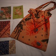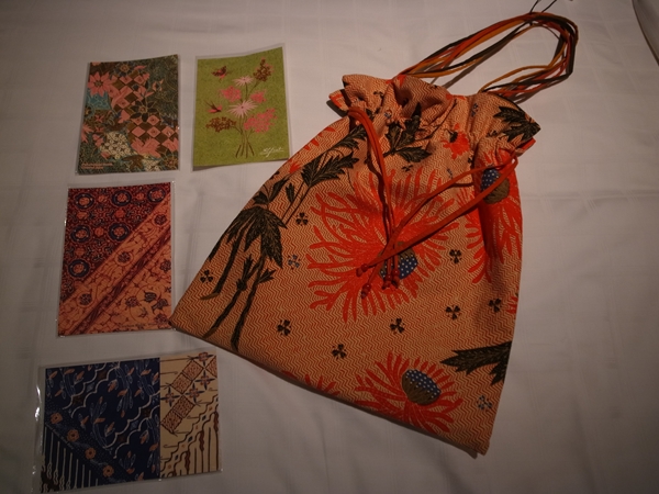 バティックを使った巾着バッグとアンティークバティックの柄をプリントしたポストカードなど合わせて450,000ルピア。