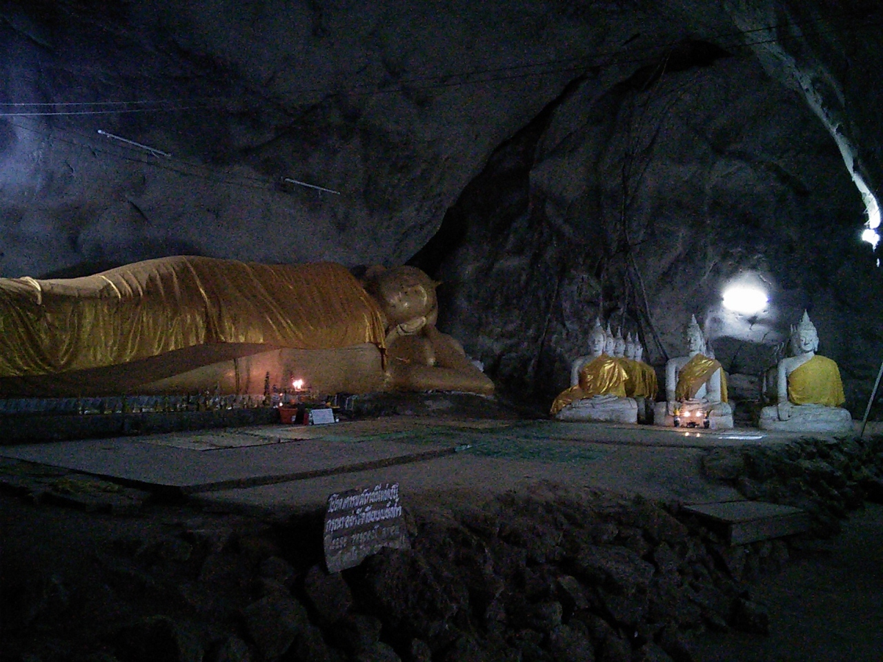 プラチュアップ キリカン市街から北へ約6Km。海沿いにある洞窟内にある涅槃像が有名な寺です。境内各所にある「Reclini... 続きを読むng Buddha Cave」の矢印看板とおりに進み、岩山の階段を登ると洞窟入口にがあります。人がいてドネイションボックスがありミニマム10分間10Bと言われました。料金を告げられるのはドネイションではないような気がするのですが…。内部には涅槃像が2体、広い空間でしたが奥行きがあまりなく10分で十分でした。10Bがちょうどなく20B払いました。お釣りはもらえないので細かいお金を用意して行った方がいいです。