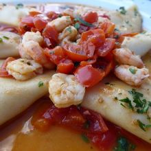 もちもちとしたラビオリに濃厚なガンベロのトマトソース。
