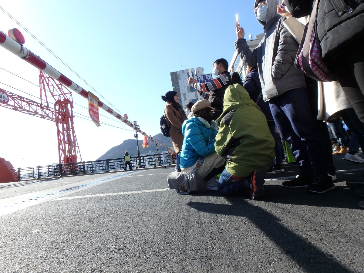 時間になり遮断機が下りはじめると観光客が車道に飛び出す
