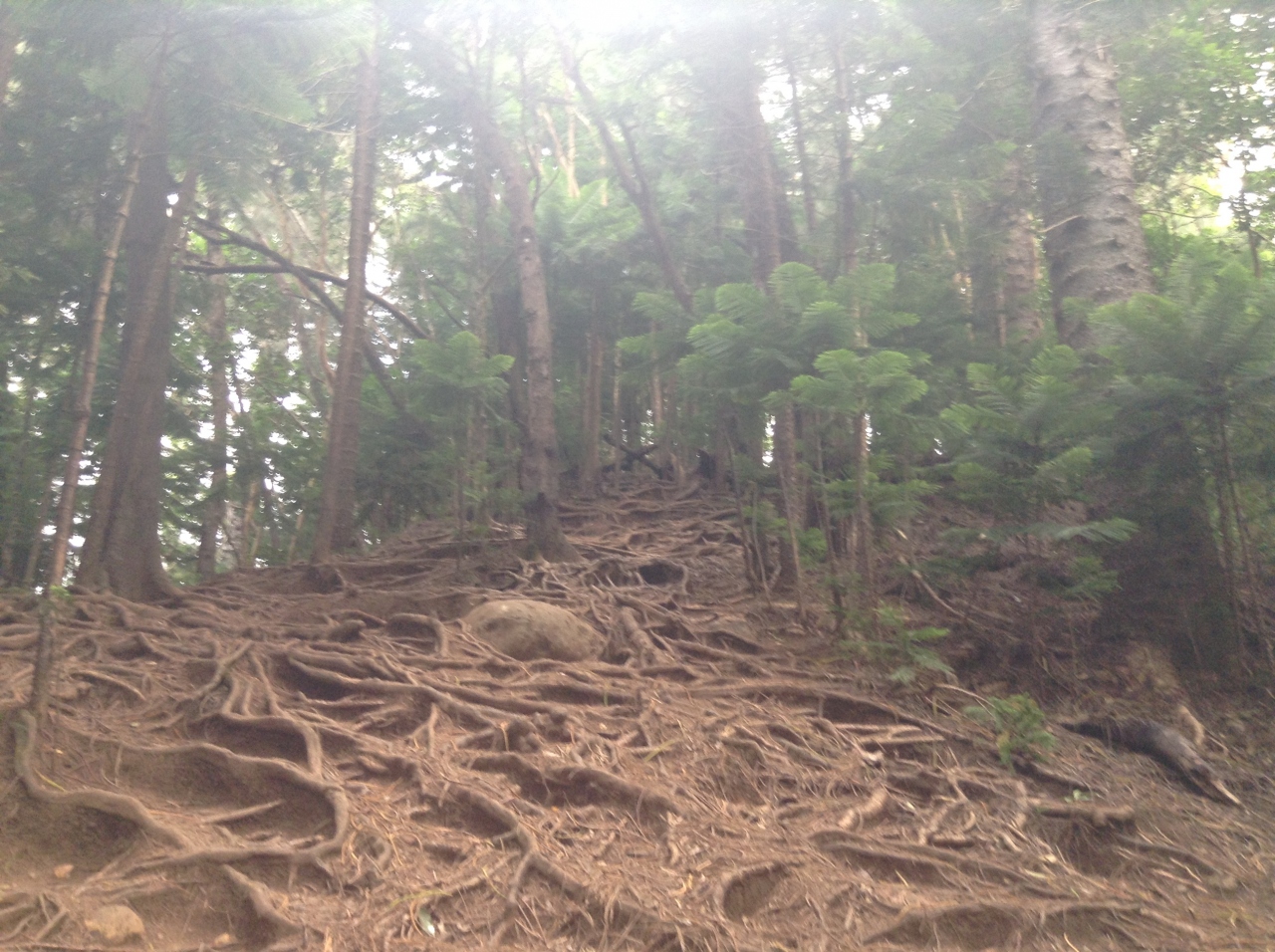 そして頂上に着く手前の坂道で、雲が晴れて東の海の絶景が拝めるかどうかドキドキするのですが、