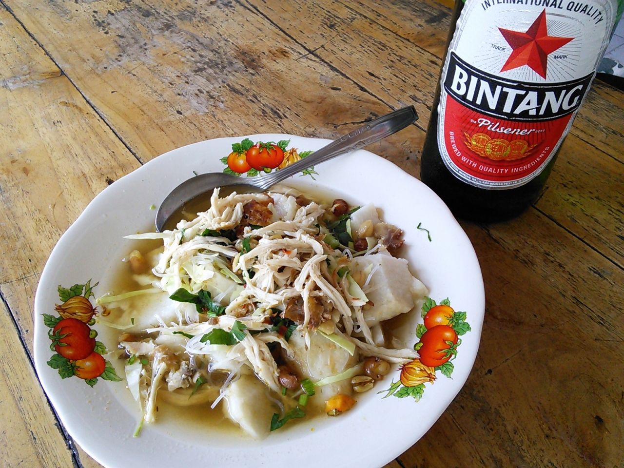 メニューはBubul Ayam(鶏のお粥)、Nasi Soto(ライススープ)、Sayur Plecing(野菜のサンバル和え)、Rujak(フルーツの甘辛ソース和え)などがありますがそう多くはありません。私はTipat Soto(ティパット ソト)Rp10000をオーダー。ティパット(ロントン)と呼ばれる蒸して固めたご飯にダシ汁をかけ鶏肉、野菜、ピーナッツをトッピングしたもの。食事というよりはおやつに近い軽食です。小腹が減ったときなどにはぴったりです。おそらく洒落たレストランにはないメニューだと思います。