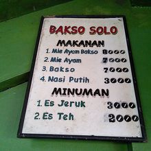 店名からもわかるようにソロ(ジャワ中部の都市)風のバクソーのようです。客が絶え間なく入っており食事時には大勢の人でにぎわっています。専門店らしく壁に掲げられたメニューはミー アヤム バクソー(Rp8000)、ミー アヤム(Rp7000)、バクソー(麺なしRp7000)、ナシ プティ(Rp3000)の4種のみ。この辺りからもこだわりが感じられます。