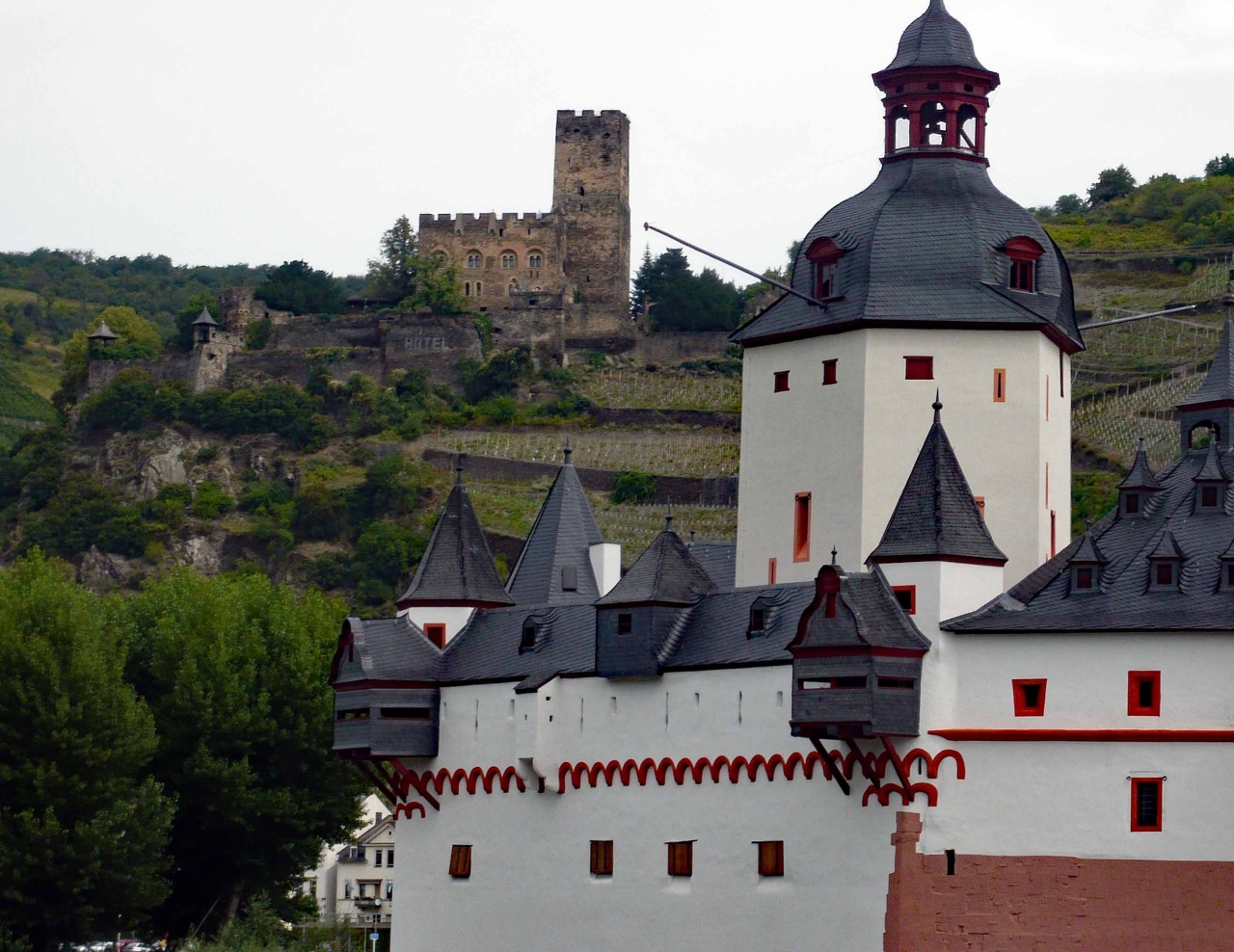 グーテンフェルス城は1200年頃にライン渓谷の軍事拠点として建造され、ライン河を航行する船から税の徴収も行っていましたが、1326年に目の前の中州に船の形をしたブファルツ城が建設され、徴税の役目を譲ったとのこと。近い場所に二つの城も城を造ったことから、通行税徴収は城を主有していたドイツ貴族にとって相当な収入となっていたことが想像されます。