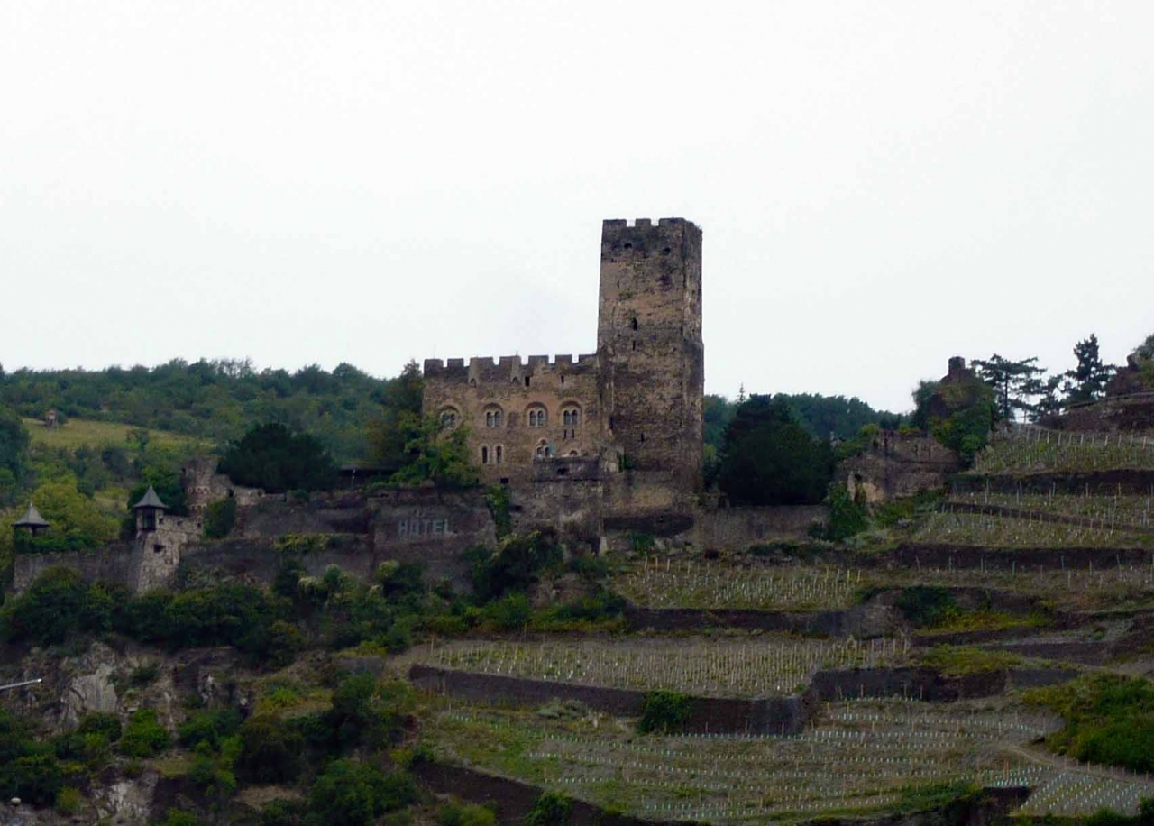 ライン川の中央にドーンと存在するブファルツ城の後方、ブドウ畑に囲まれた丘上に見えるのは、グーテンフェルス城(Burg Gu... 続きを読むtenfels am Rhein)。ライン下りの際に遊覧船から見る景観です。カラフルで存在感のあるブファルツ城に比べ、黒ずんだ淡茶色のグーテンフェルス城は遺跡のようでした。廃墟ではなく、現在、古城ホテルとして使用されているとのことです。