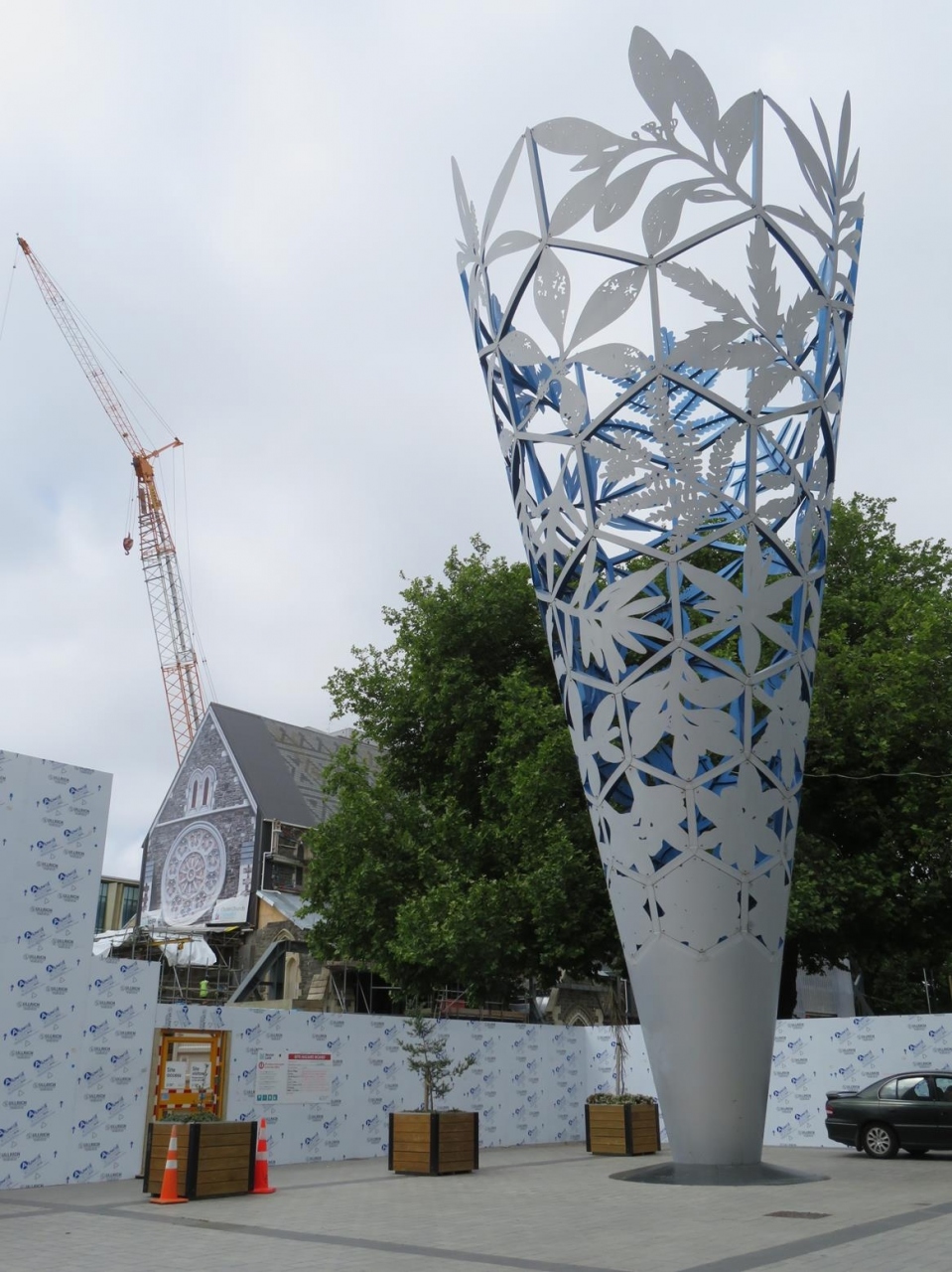 聖杯のモニュメントは工事中の囲いの中にあり