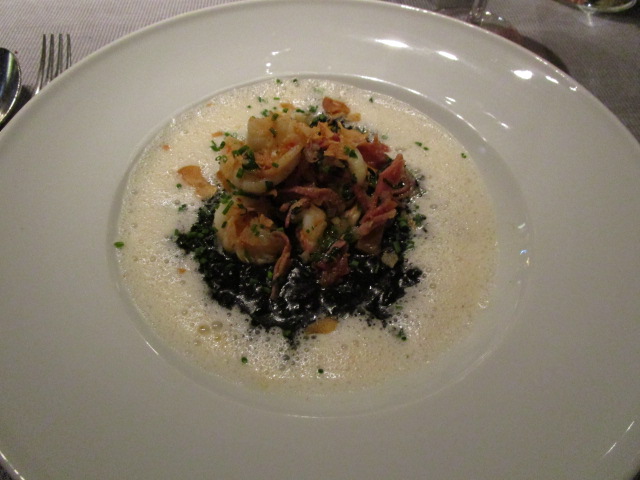 特に、ここのスペシャリテの前菜が美味しかった! イカ墨リゾットに、クリーミーあわあわソース。海老とイカとにんにくチップス添え。