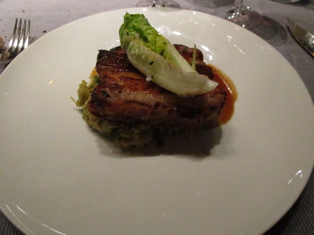 メイン:豚のキャラメリゼ。外側カリカリ中ジューシー。野菜添え