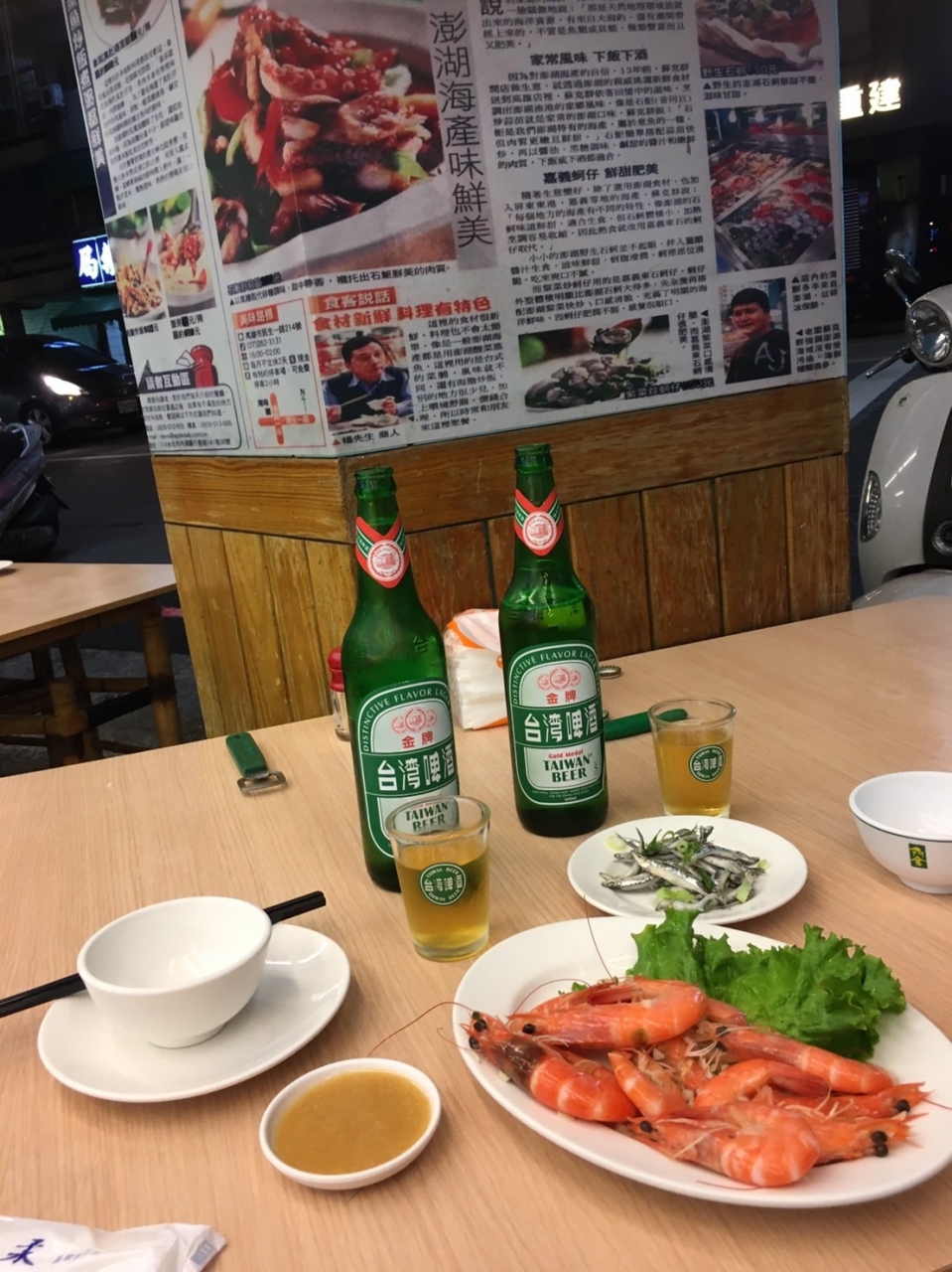 お通し、エビ、空心菜の炒め物、アワビ(2個)、桜エビチャーハン、瓶ビール2本で960元。最後にスイカのサービス付き。