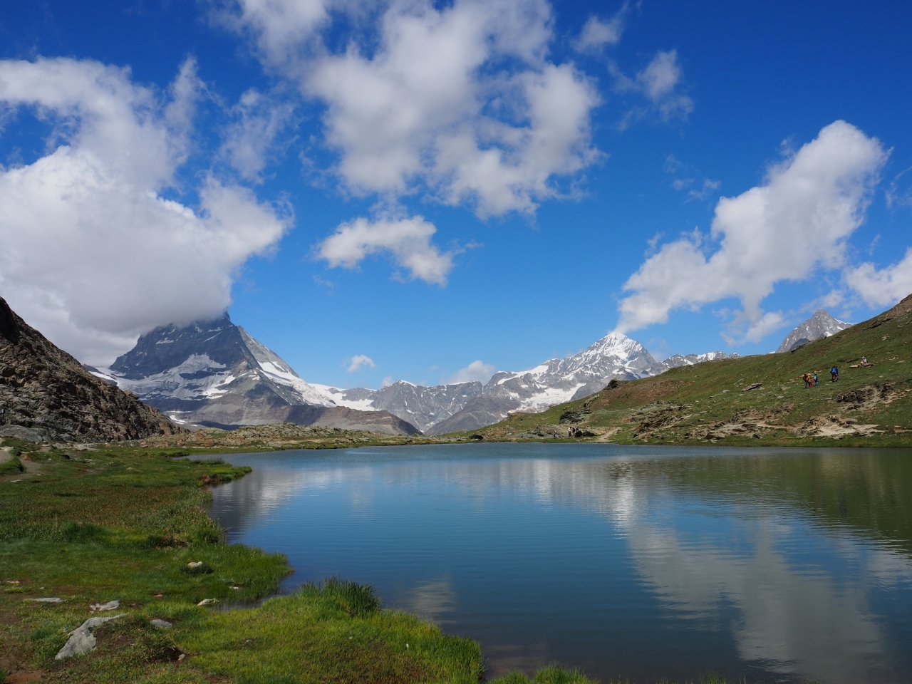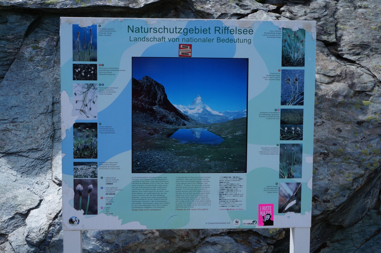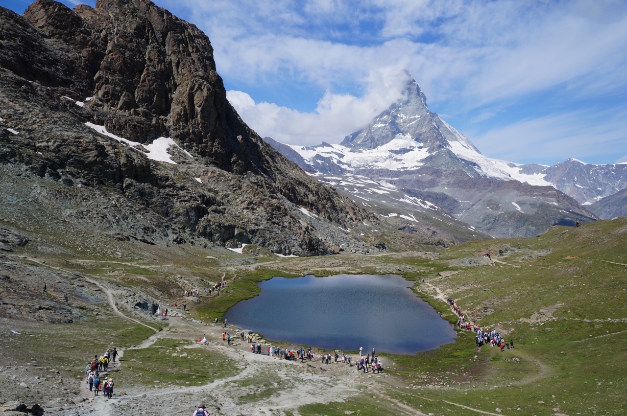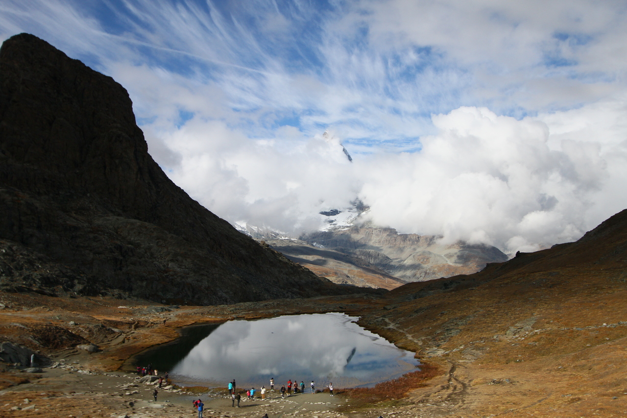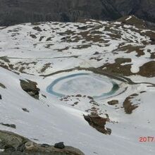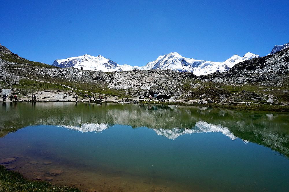 標高2757mのところに位置し、ゴルナグラード鉄道の終点から一駅前のローテンボーデン駅(2815m)から急な坂を下ったとこ... 続きを読むろにあります。水は濁り、小さな魚が泳いでいるのが見えます。水深は最深で4mだそうで、0.45haしかない小さな湖です。逆さマッターホルンの写真が撮れることで多くの観光客を呼んでいます。私達が行った時は快晴の天気で、日本人観光客ばかりでなく中国人観光客も大勢来ていて、湖岸は大変賑わっていました。最初湖手前の小高い岩の上から湖を見ましたが、ほとんど湖面にマッターホルンは映っていませんでした。もうお昼を過ぎていて風のため湖面にさざ波が立っているせいだと思っていましたが、その後で下に降りて湖のそばまで行ってみると、クリアではないけれど、なんとか上にいるときよりはましな逆さマッターホルンが見れました。風があると湖面が波立ち、逆さマッターホルンは見えません。なるべく風の吹かない朝方に訪れるのが良いでしょう。 閉じる