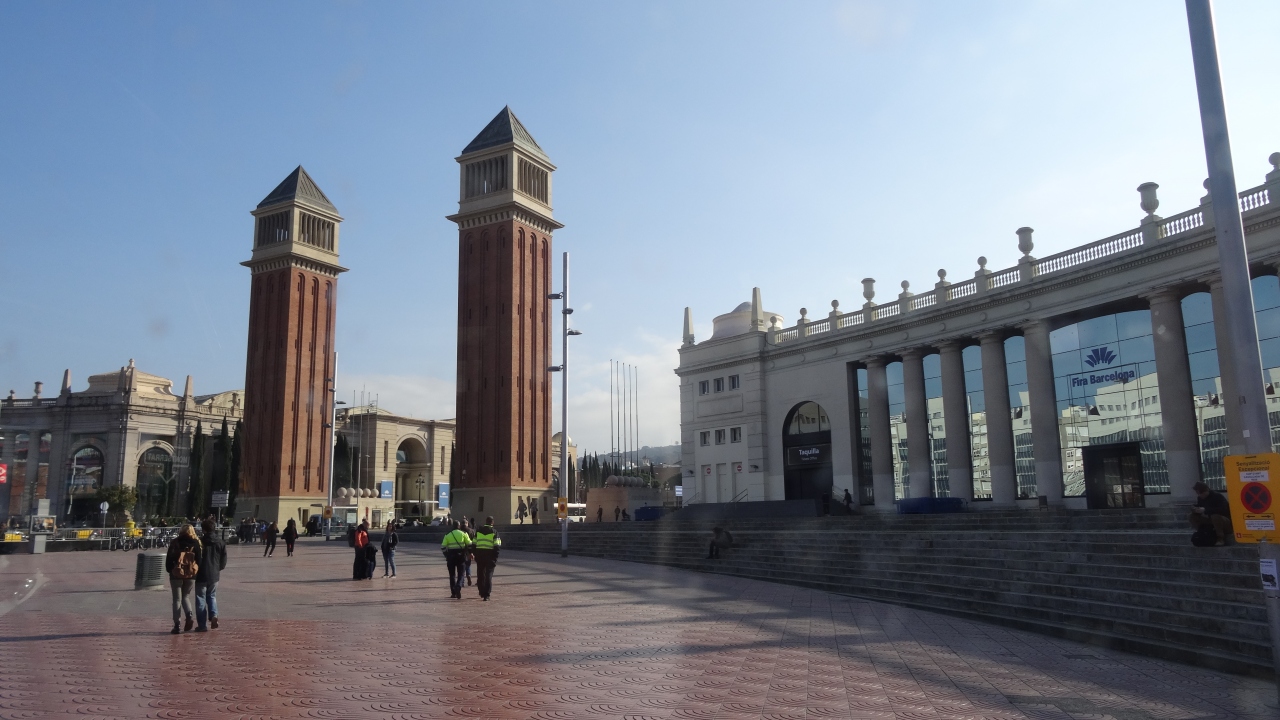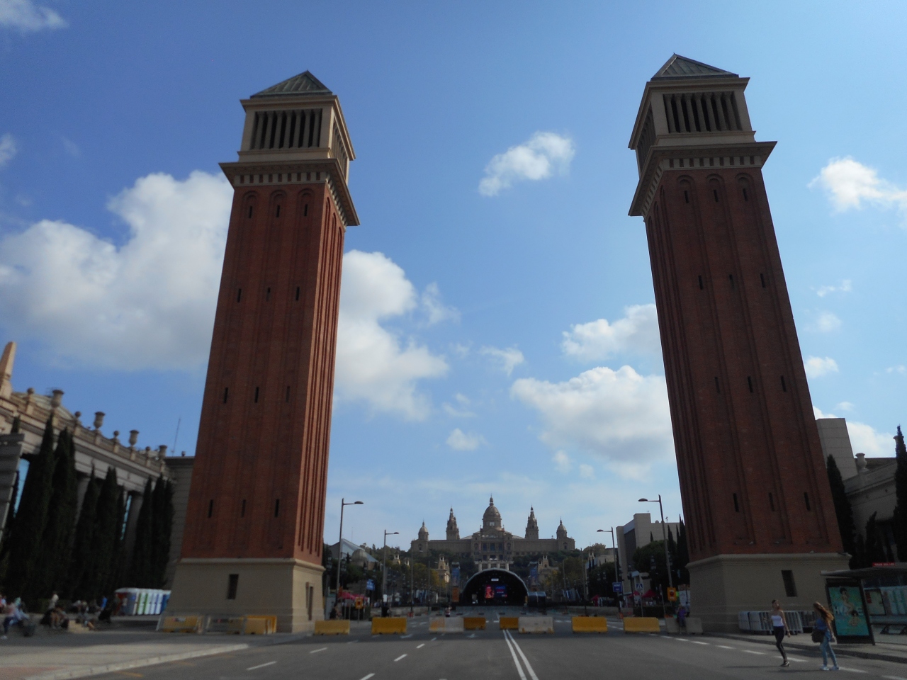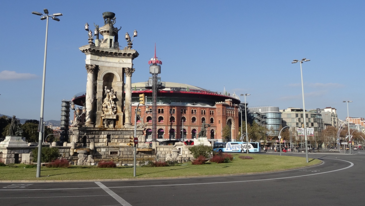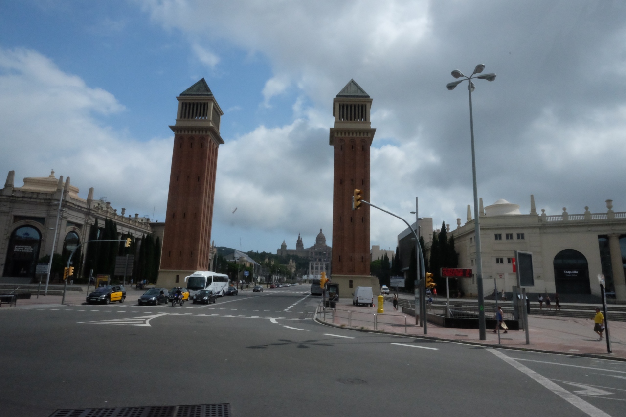 ツインタワーはベニスの塔、円形の建物は元闘牛場のアレーナスシッピングセンターです。宮殿風な建物であるカタルーニャ美術館やその上のオリンピックスタジアムといったモンジュイックの丘周辺の観光の起点となる広場でもあります。この広場が最寄りの地下鉄の駅となり、ここから徒歩、あるいはバスで向かいます。もちろん、この広場には、観光バスも必ず通過しますし、サンツ駅からも徒歩10分程です。また、サンツ駅から来る場合、アレーナスシッピングセンターの裏手はミロ公園となっており、ミロのモニュメントがあります。