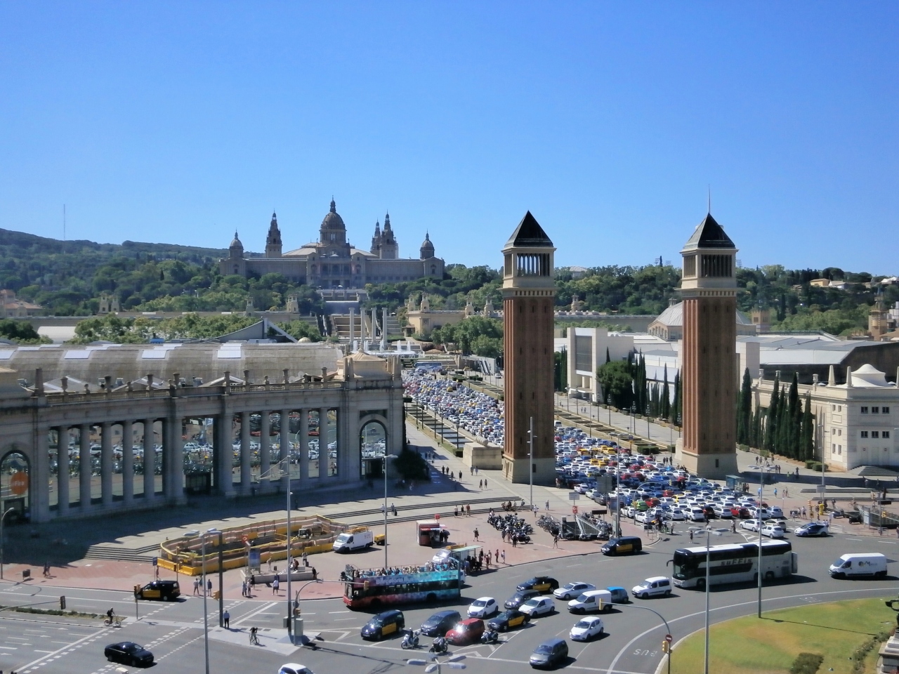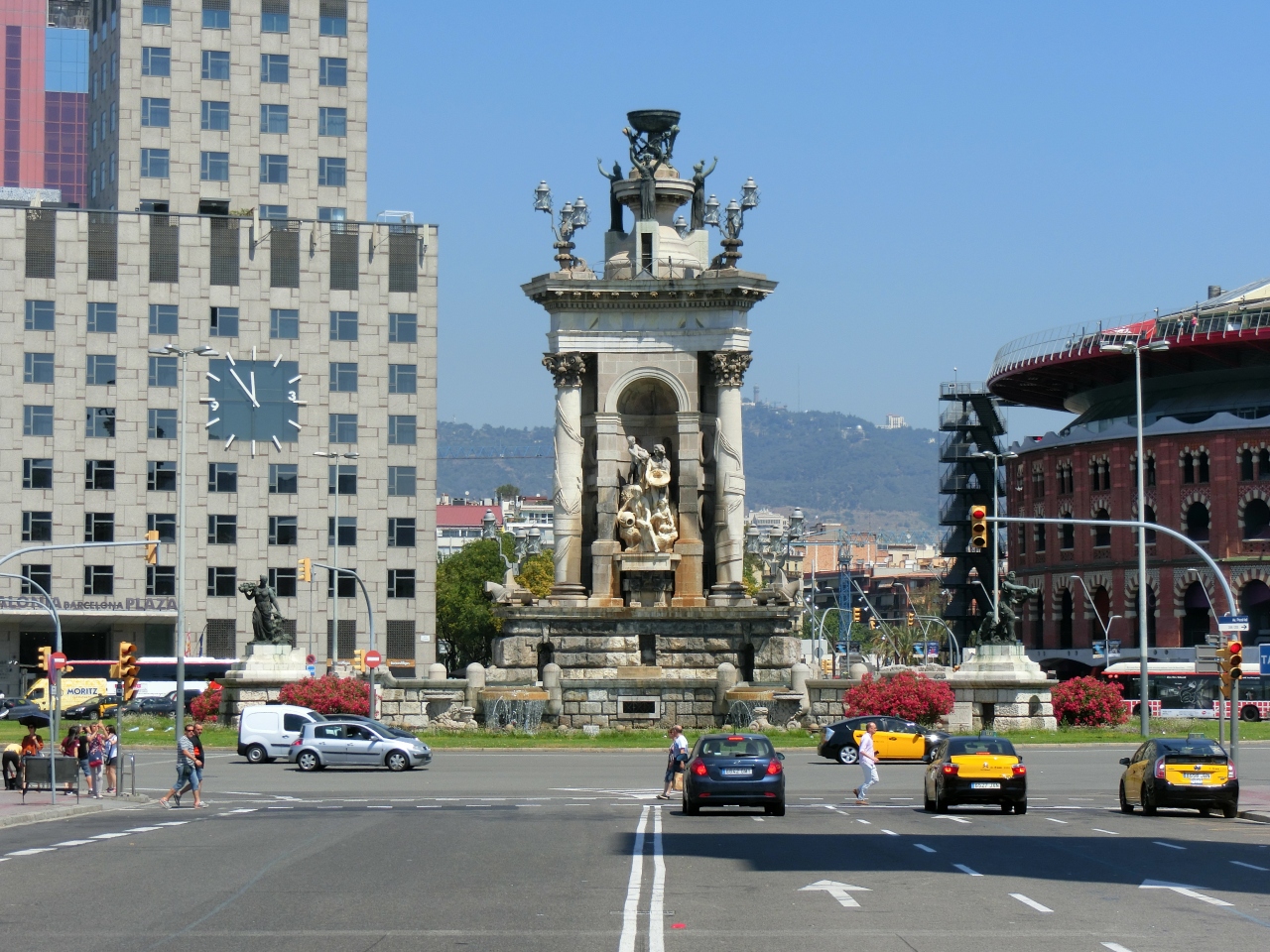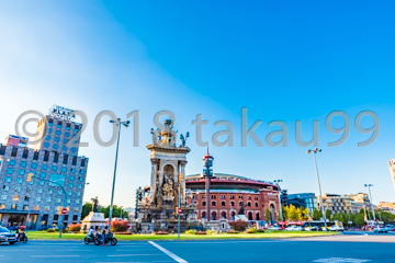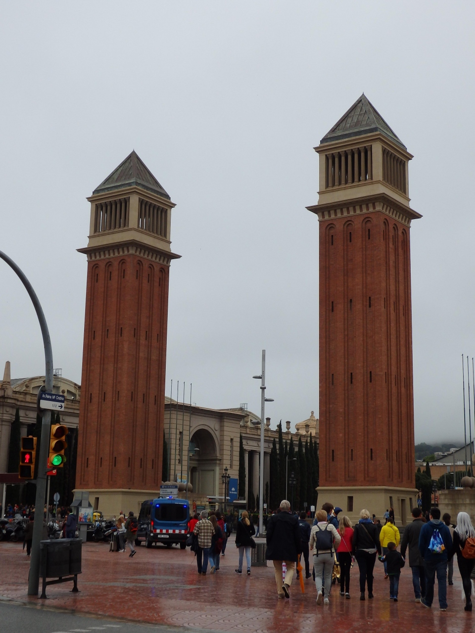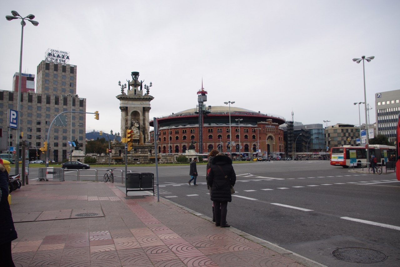 ツインタワーはベニスの塔、円形の建物は元闘牛場のアレーナスシッピングセンターです。宮殿風な建物であるカタルーニャ美術館やその上のオリンピックスタジアムといったモンジュイックの丘周辺の観光の起点となる広場でもあります。この広場が最寄りの地下鉄の駅となり、ここから徒歩、あるいはバスで向かいます。もちろん、この広場には、観光バスも必ず通過しますし、サンツ駅からも徒歩10分程です。また、サンツ駅から来る場合、アレーナスシッピングセンターの裏手はミロ公園となっており、ミロのモニュメントがあります。