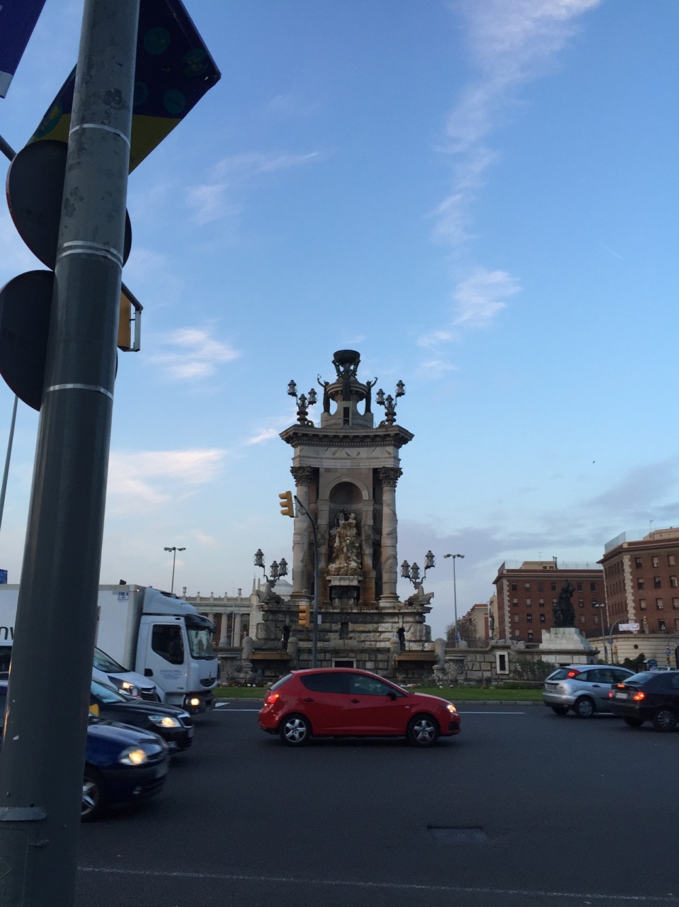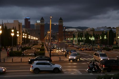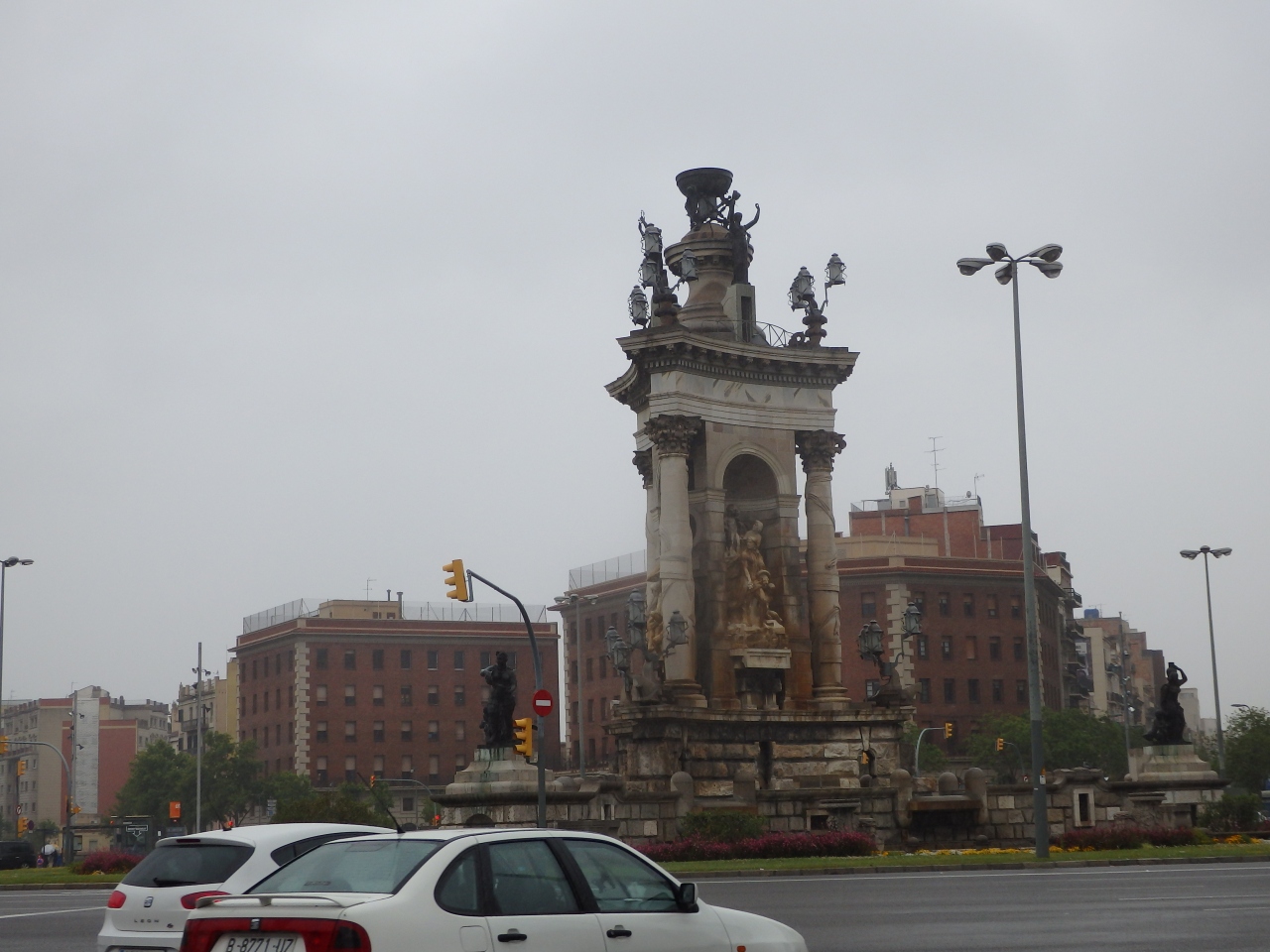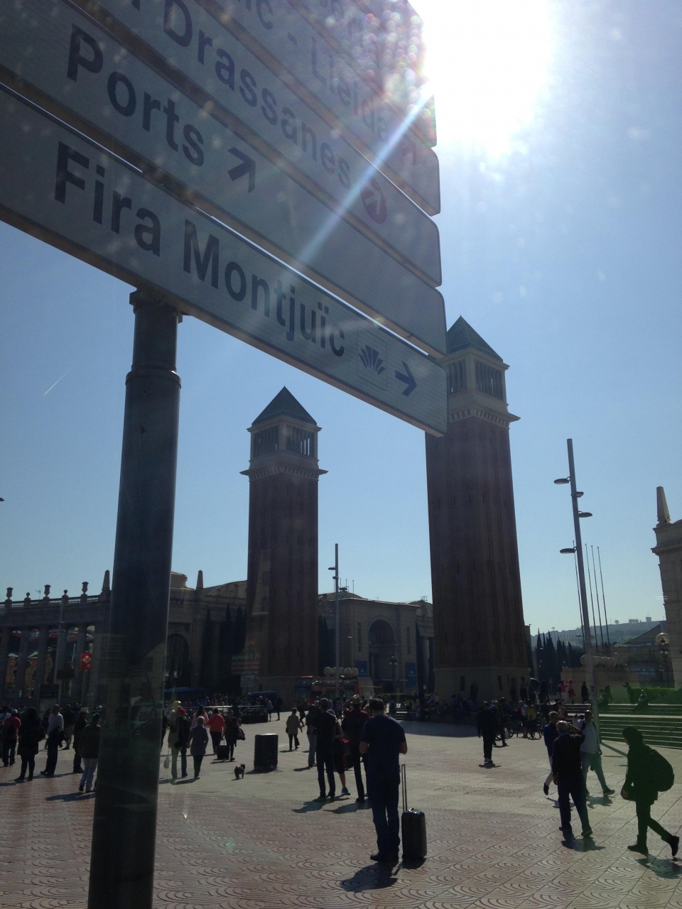 ツインタワーはベニスの塔、円形の建物は元闘牛場のアレーナスシッピングセンターです。宮殿風な建物であるカタルーニャ美術館やその上のオリンピックスタジアムといったモンジュイックの丘周辺の観光の起点となる広場でもあります。この広場が最寄りの地下鉄の駅となり、ここから徒歩、あるいはバスで向かいます。もちろん、この広場には、観光バスも必ず通過しますし、サンツ駅からも徒歩10分程です。また、サンツ駅から来る場合、アレーナスシッピングセンターの裏手はミロ公園となっており、ミロのモニュメントがあります。