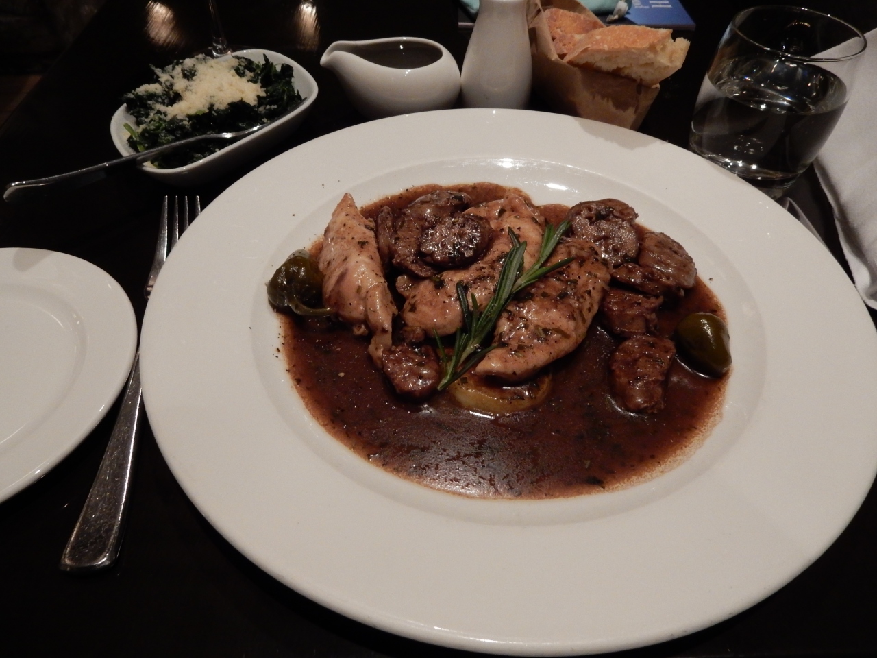 注文はロゼワインとチキン胸肉とソーセージのソテー、最後にアイスのデザートを食べました。ワイン5ポンド、メイン15ポンド、デザート5ポンドぐらいの価格帯です。