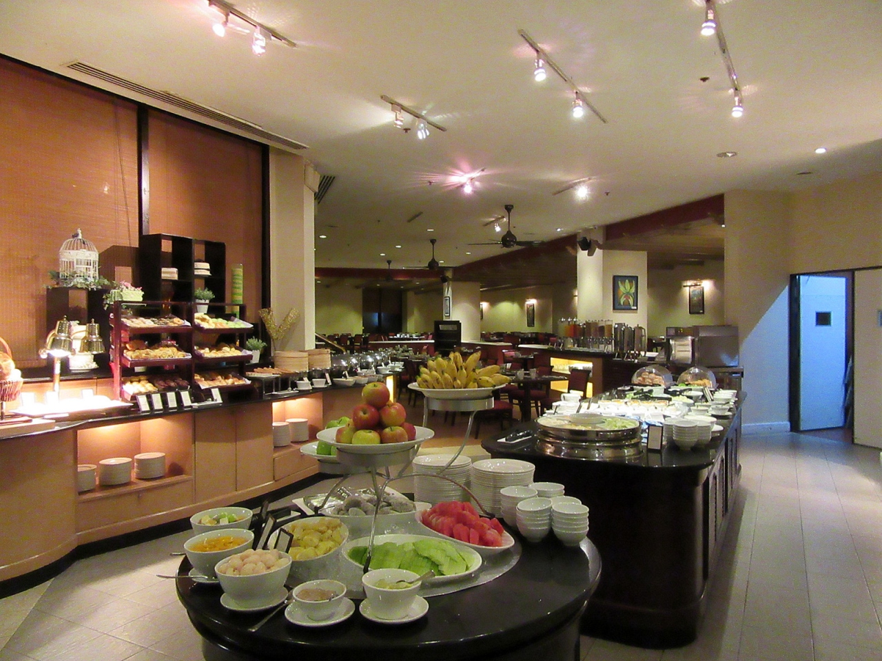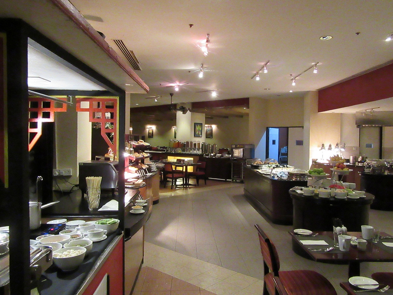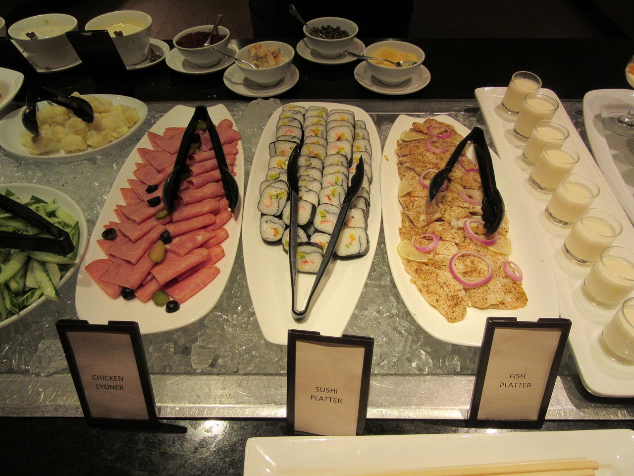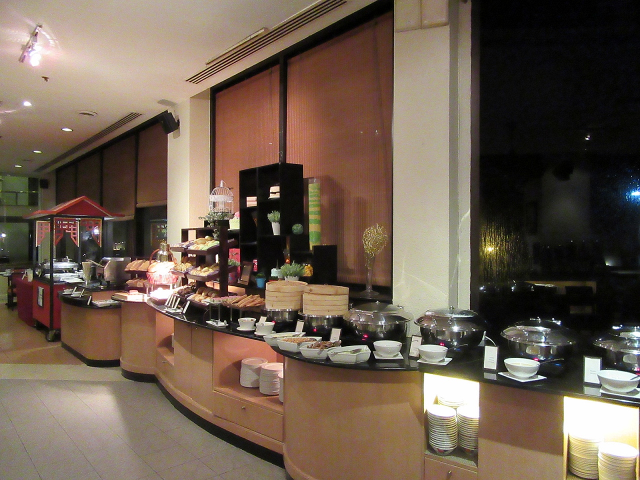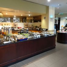 入口側から店内中央部分まではビュッフェ台が並んでおり…