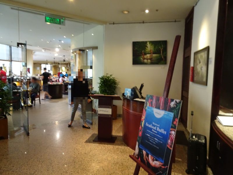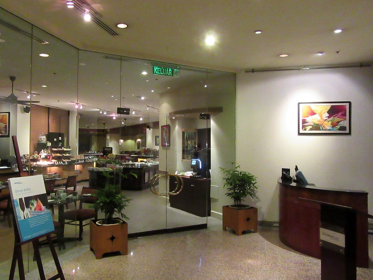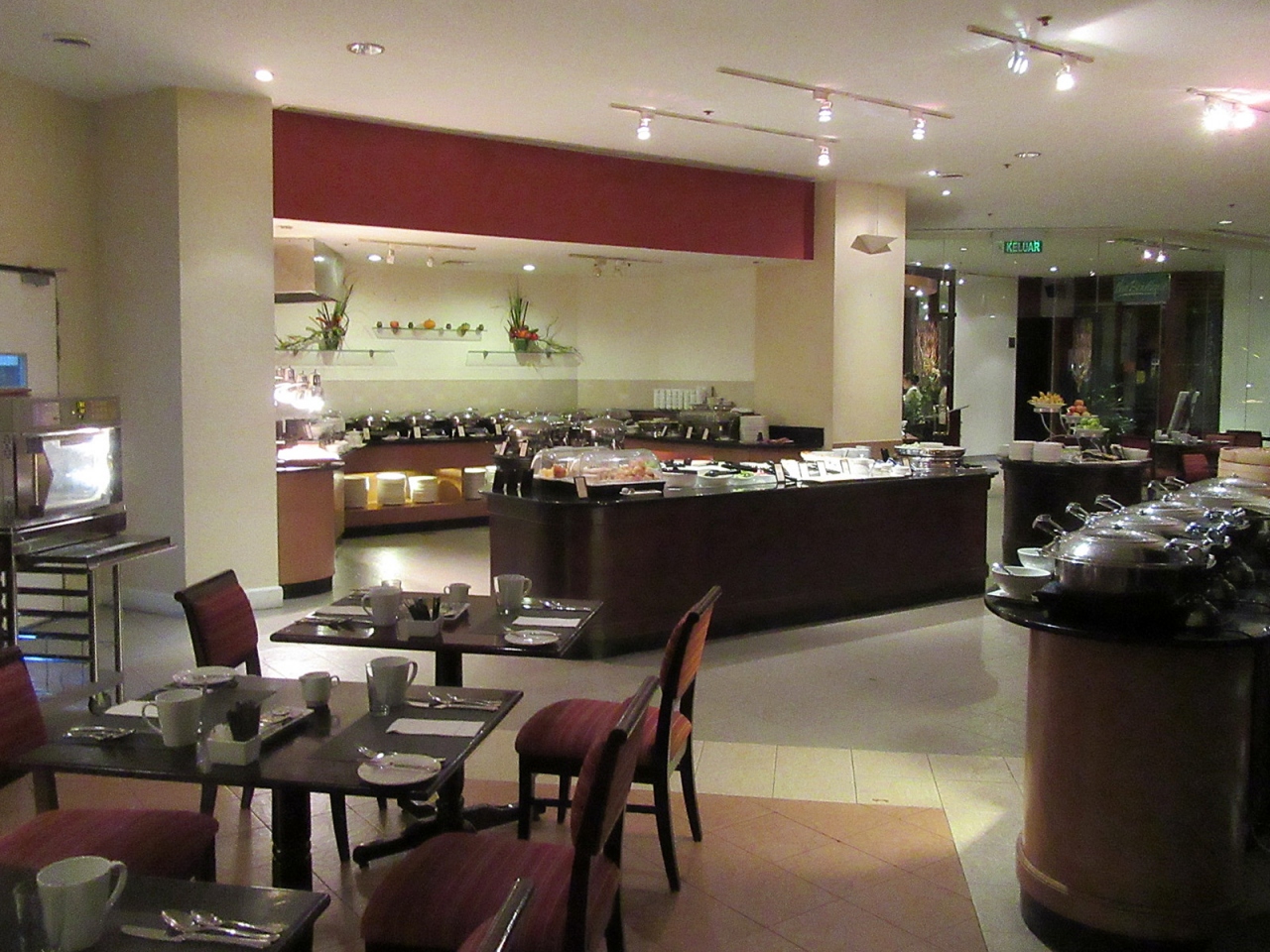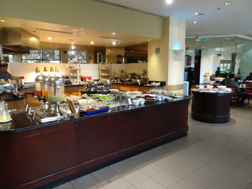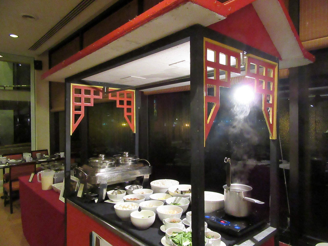 入口側から店内中央部分まではビュッフェ台が並んでおり…