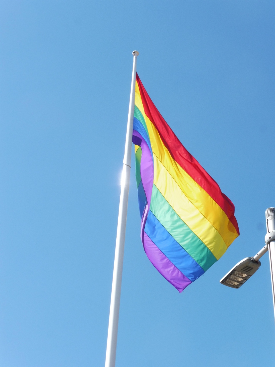またゲイカルチャーのシンボルのレインボーの巨大な旗が風で揺れています。 閉じる投稿日:2018/06/17