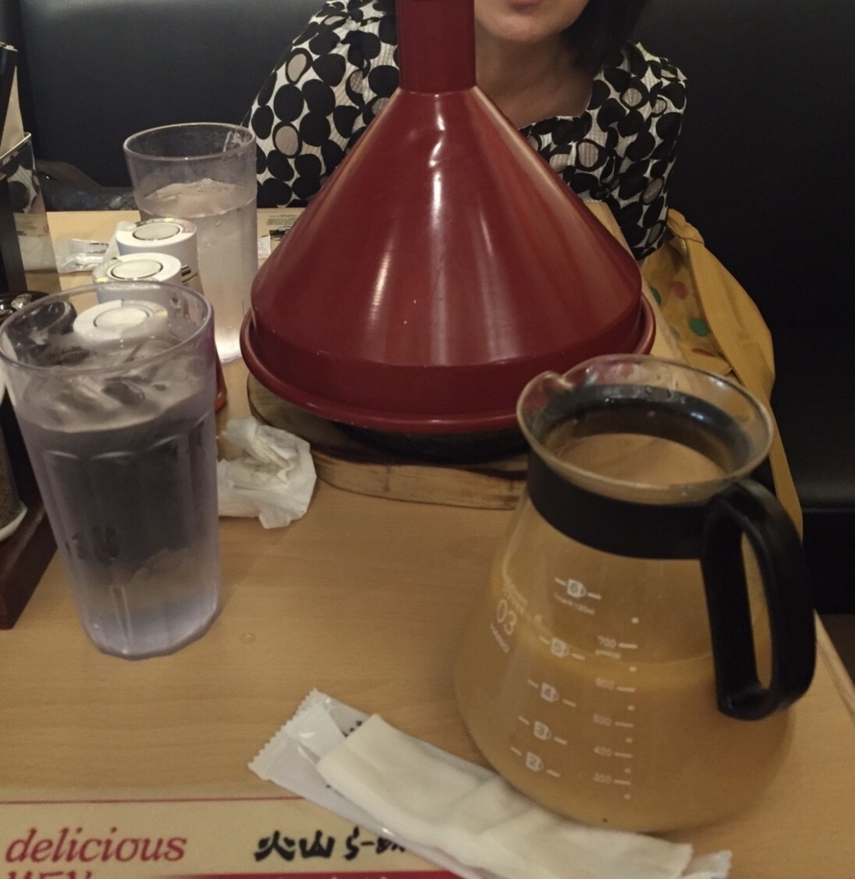 麺と具材が入っている石焼鍋が運ばれ、コーヒーメーカーのガラス容器に入ったスープをテーブルで注ぎ入れ、しゃぶしゃぶ鍋の真ん中みたいなので蓋をして、砂時計の砂が落ち終わるまで待ちます。