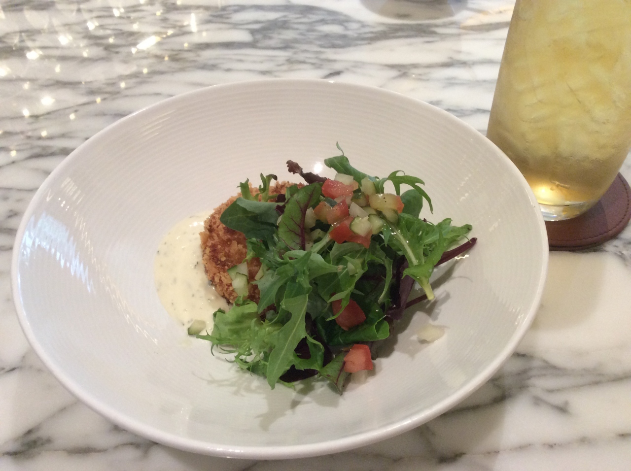 サーモンのコロッケのサラダトッピングと、ミートペペロンチーノを頼んでみたが、