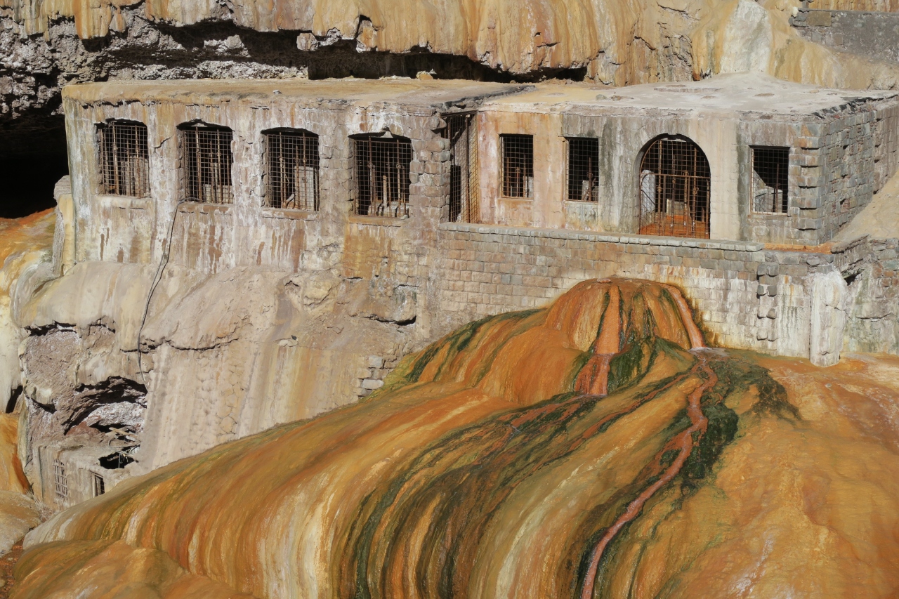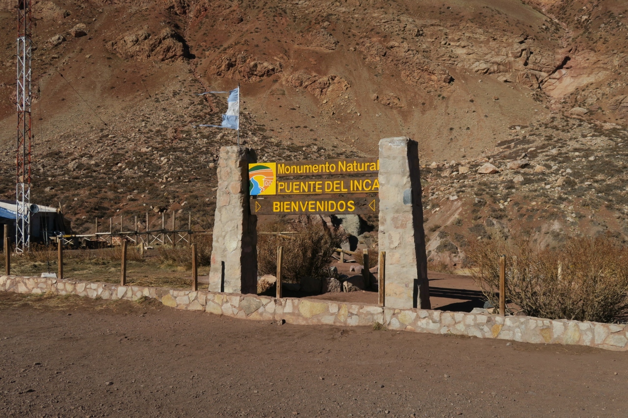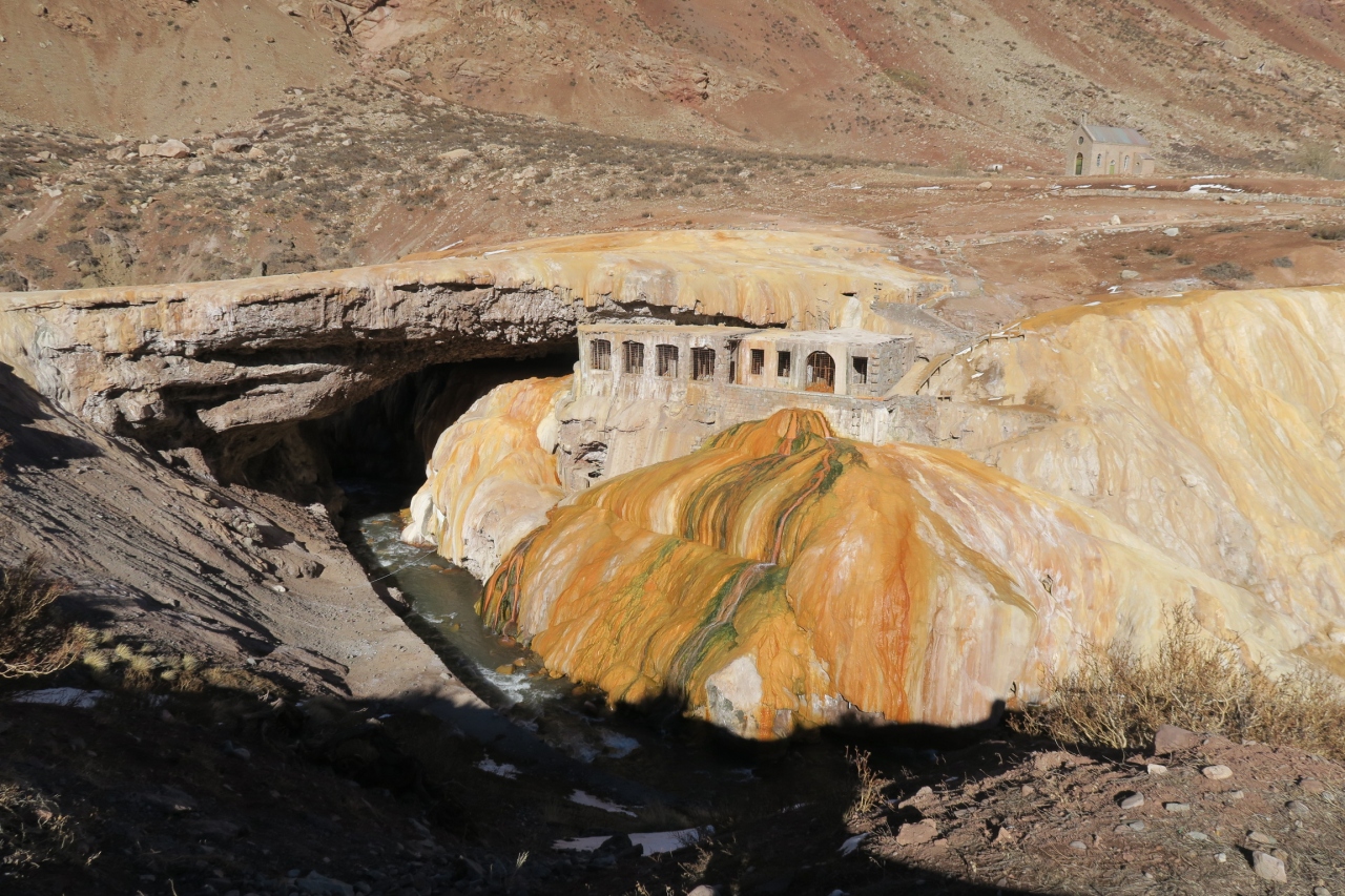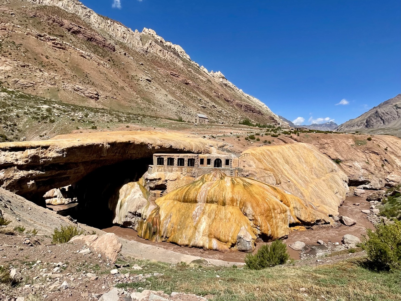 メンドーサからチリとの国境沿いのアンデスの高地をめぐるツアーに参加して訪れました。氷河によって運ばれた岩の上に、温泉のミネ... 続きを読むラル成分が長い時間をかけて幾層にも重ねられて塊となり、そばを流れる川が下層部を侵食し、天然の橋が形成されました。黄色ですが成分は塩で、硫黄などの匂いはまったくしません。お土産屋や今は使われていない鉄道の施設などもあります。