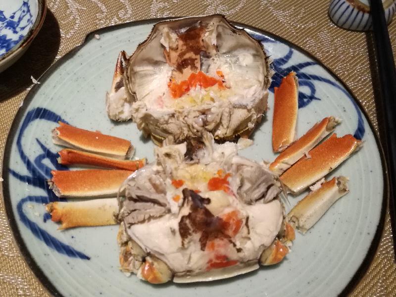 蒸し鶏、蟹味噌入りの水餃子に蟹肉、蟹ミソ入り野菜の炒め煮。