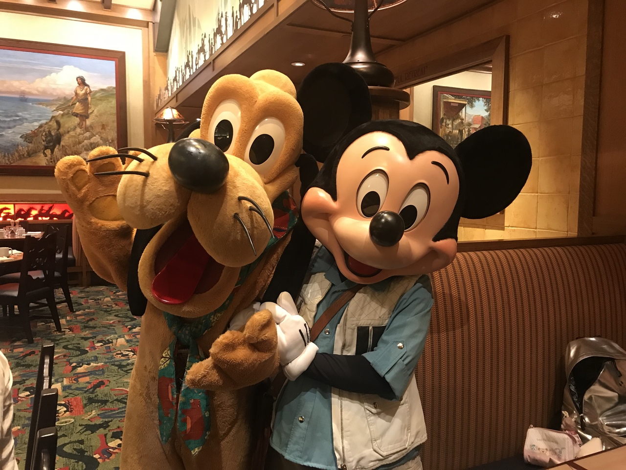 でもやはり全員と写真を撮りたかったので、30分に1回行われるキャラたちの店内行進タイムで店内を廻っている時に「ミッキー!!」と声をかけてここにいるよアピールをしたところ、行進タイム以降は2回廻って来てくれました。