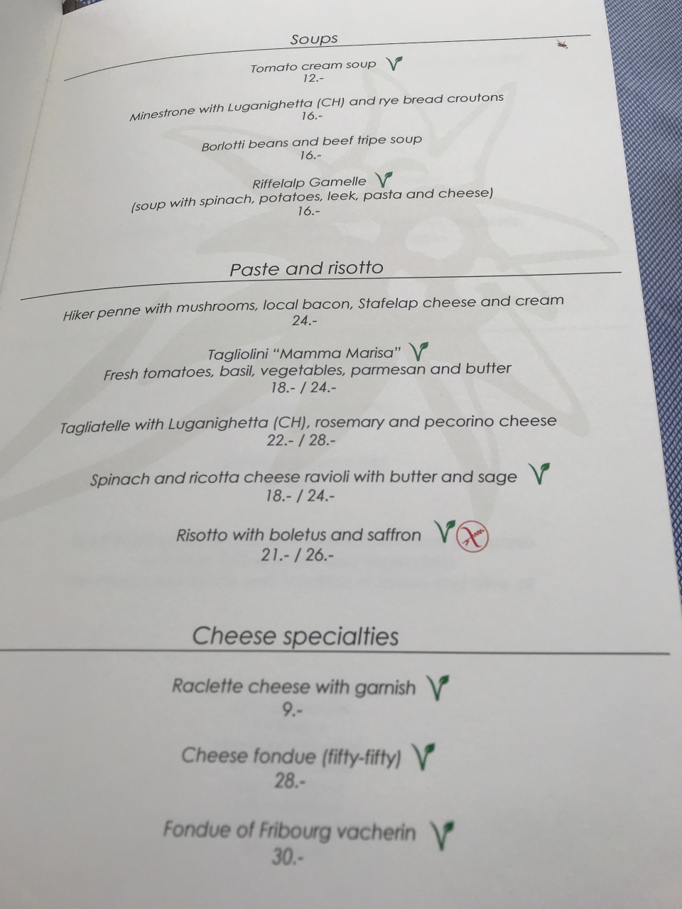 向かいの高級ホテル「リッフェルアルプ・リゾート」と系列なので、料理も洗練されていて盛り付けも味もとても良く、何を食べても美味しいですが、ミネストローネ(16CHF)は今までに見たことがないくらい具が沢山入っていて、それだけでお腹一杯になります