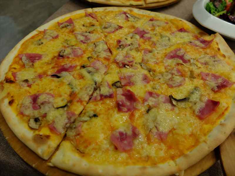 私たちはシェア用のグリーン・サラダとサラミ・ピザ、それにマッシュルームとハムのピザをオーダー。