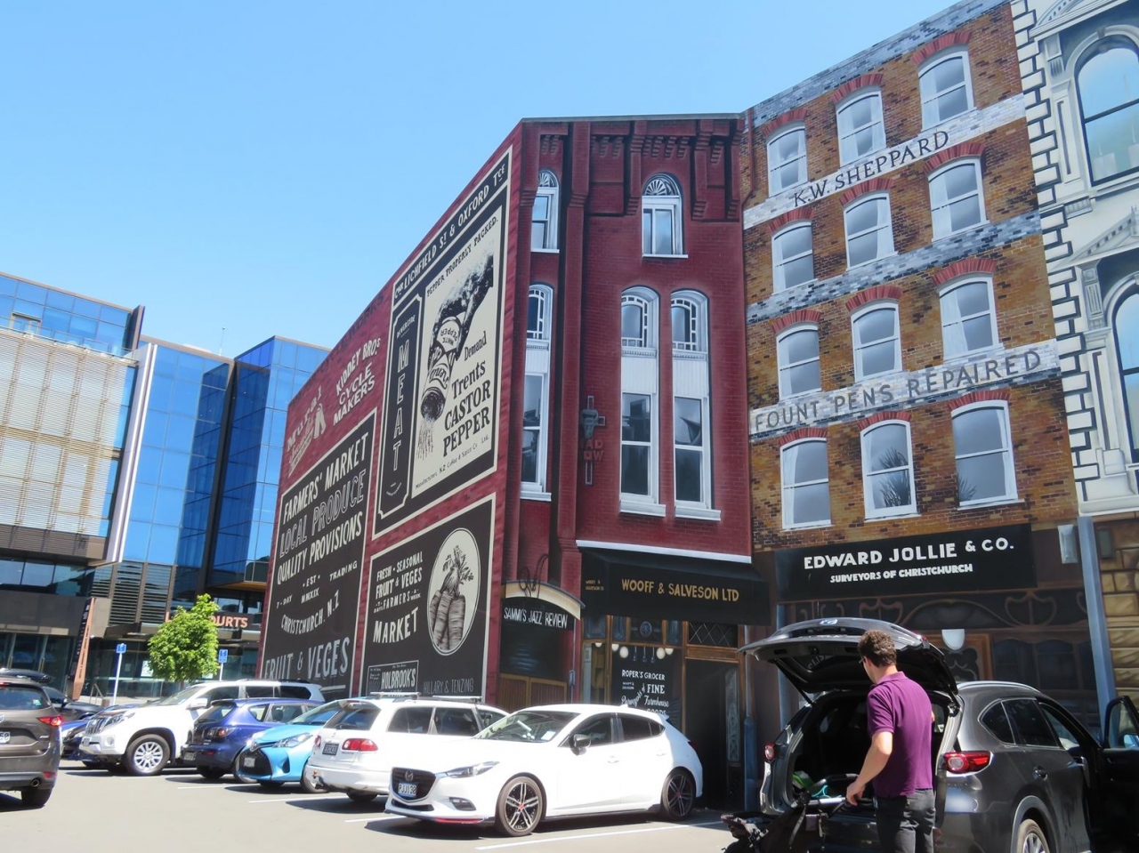 駐車場に面した外壁はおもしろい絵柄で飾られています