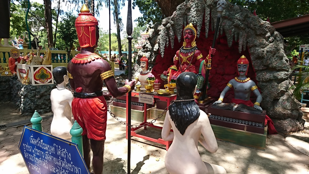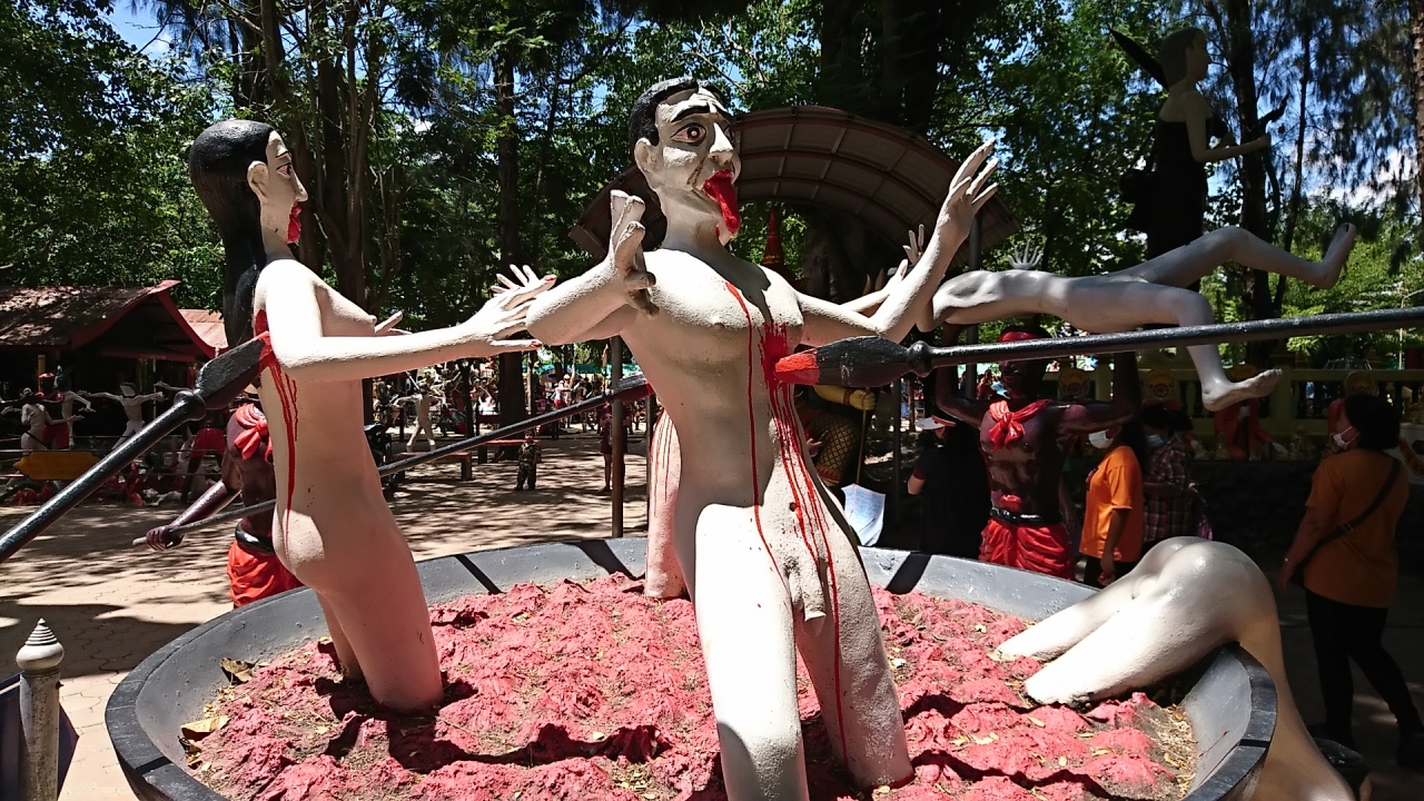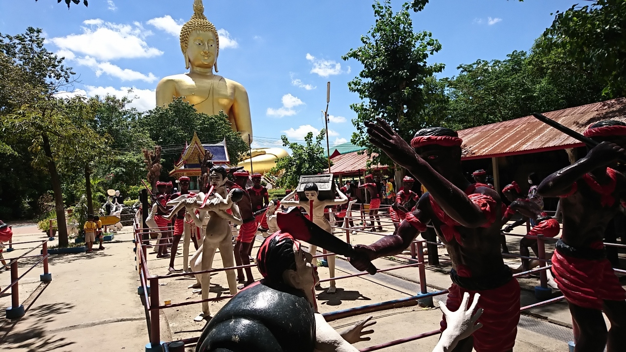 タイで最大級の仏像がある。この仏像は高さ91メートルあり現在のタイにある仏像の中では一番大きい。大仏の手前で全体像を見なが... 続きを読むらお参りするのも良いが、ここでは仏像の下まで行き、指に触れながら祈るのがワットムアン流。仏像の他に、境内内が鏡で装飾されている通称「鏡の間」ではインスタ映えバッチリ。さらに子供の教育用に作られている地獄エリアではおどろおどろしい雰囲気の彫刻が沢山あって、これも見どころの一つである。