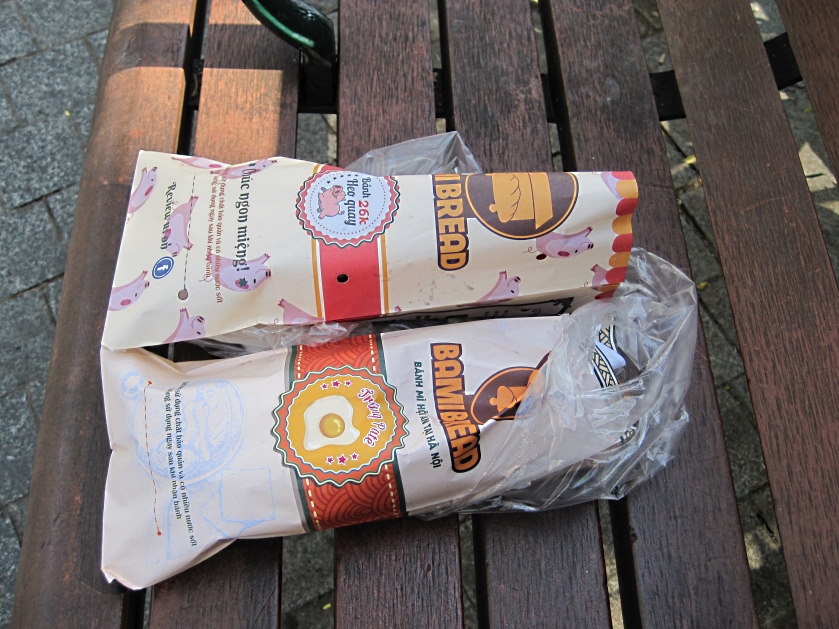全部入りらしきバインミーとスパイシーなバインミー2本をテイクアウトにて購入... 続きを読む、ホアンキエム湖畔の木陰で食べることにしました。