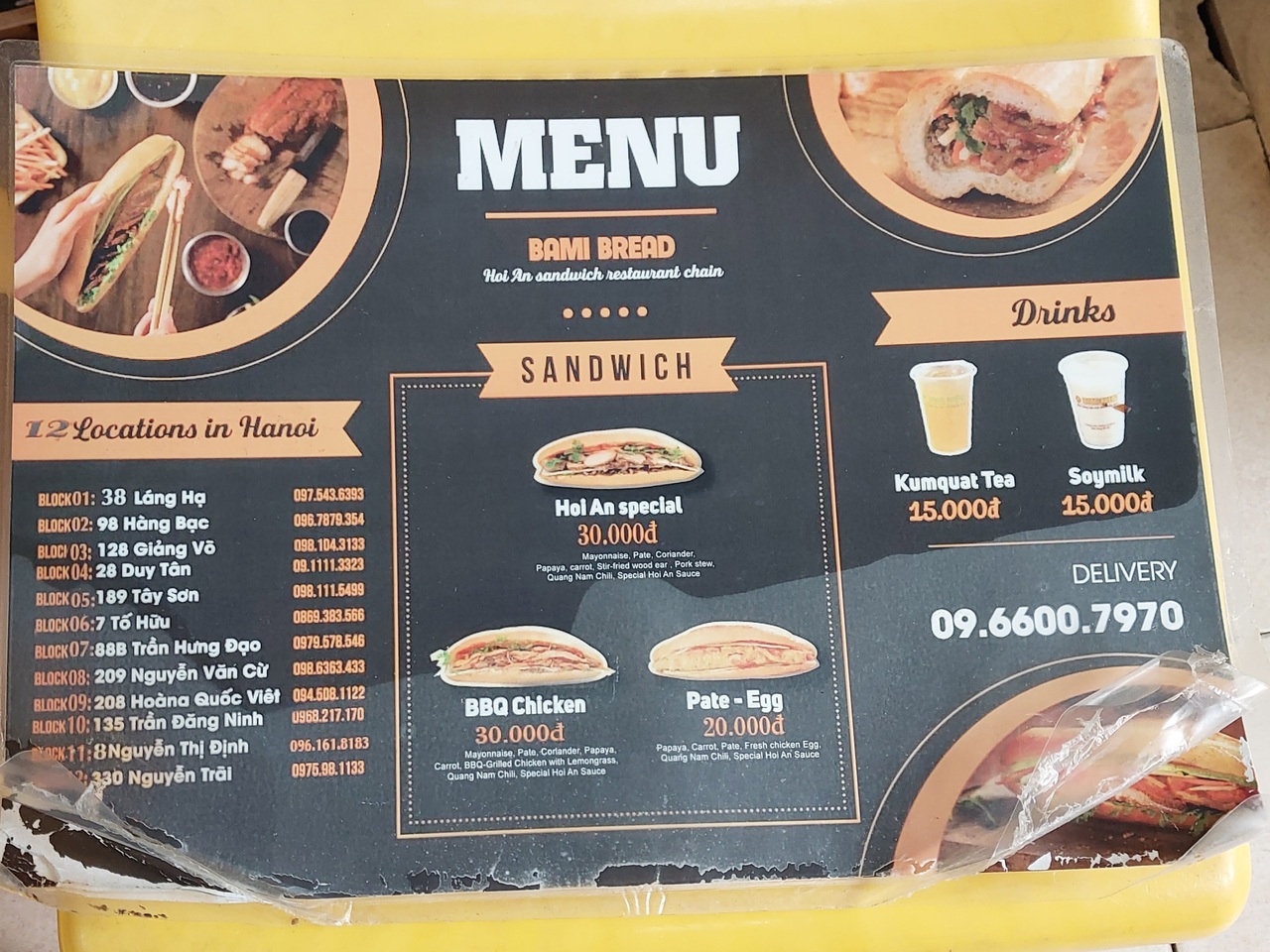 朝食は、大好きなバインミーを食べます。 私個人としてイチオシのバインミーホイアンに行って、エッグとチキンの2種類のバ... 続きを読むインミーをテイクアウトで購入、価格は両方で52,000VNDでした。 朝からしっかり食べて、元気をつけます。 閉じる