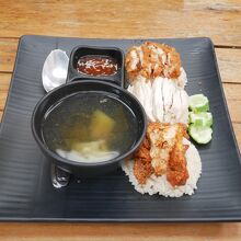 ここで有名なのは「4種(の小さな)カオマンガイ(が一つのお盆に盛られている)」。
