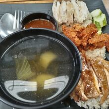 ①照り焼きチキン②ガイセープ(唐辛子+ハーブ)③茹で鶏(定番カオマンガイ)④揚げ鶏(ガイトート)の真ん中に鶏がらスープ。辛めナムチム(タレ)と甘めのナムチムが添えられています。