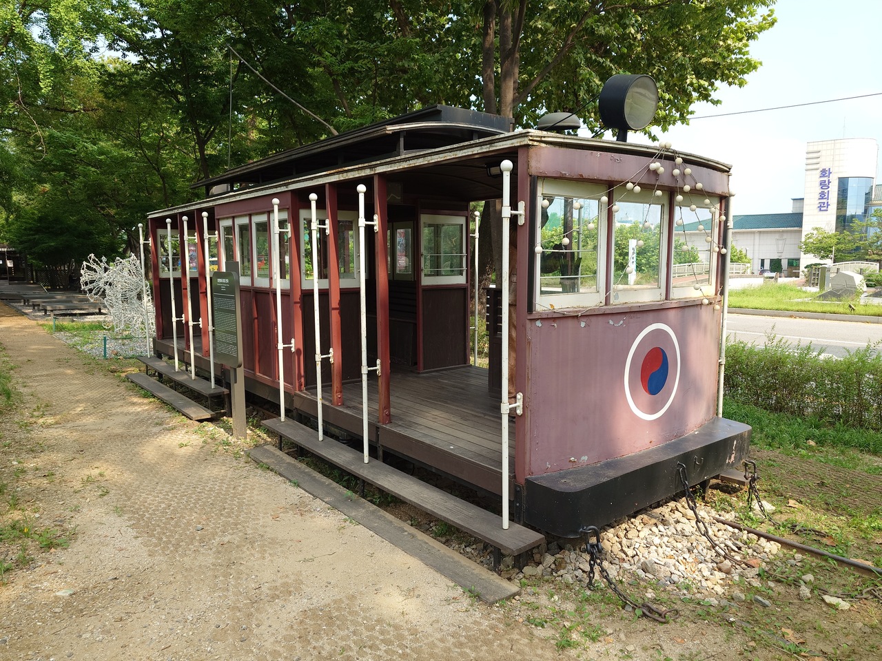 花郎台鉄道公園は、2018年に残った駅の施設を利用して整備された鉄道公園で、実際に使用されていた線路に、韓国で活躍したムグンファ号で活躍していた車両や韓国初の電車、ミカサ形蒸気機関車(日本で製造)、さらにはチェコの路面電車タトラT3形(東欧で一般的だった車両)、さらにはかつては大阪市電で活躍し1969年に広島電鉄に移籍した900形(元大阪市電2600形)が2018年に譲渡され展示されています。屋外展示なのであまり車両の状態は良いとはいけませんが、社内にはエアコンが設置されたことを除き、広告や案内図も含めて広島で走っていた当時のままで、車内も開放されています。駅舎は京春線当時の資料館、鉄道模型のジオラマ展示の建物(有料)、汽車の走る風景というおしゃれなカフェがあります。ジオラマは韓国では他に見たことのないレベルのものですが、走る車両は日本の車両のカラーを変更していたりで、韓国新幹線KTXは少し寂しい感じでした。夜は公園内がライトアップされて、昼とは違う様子になるとのことです。