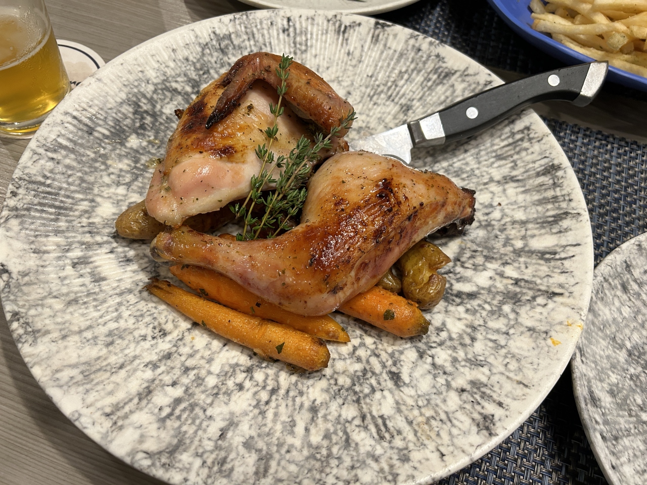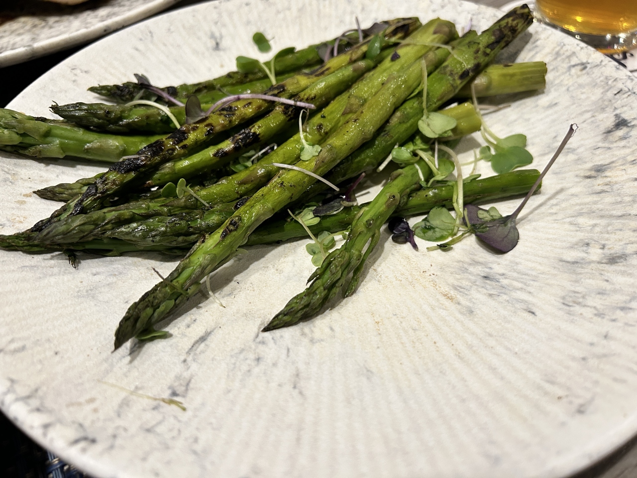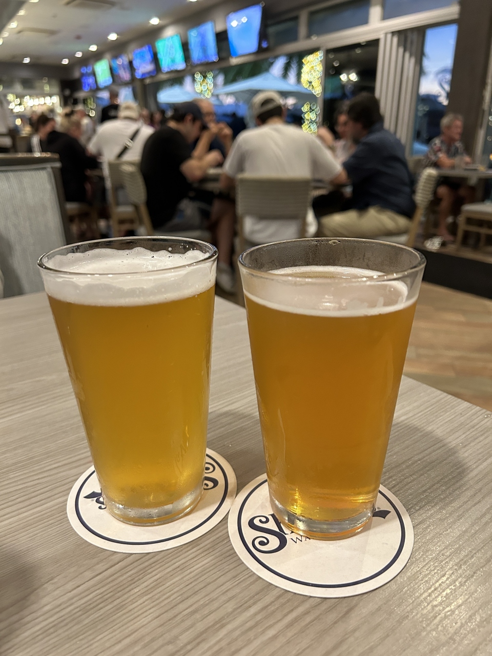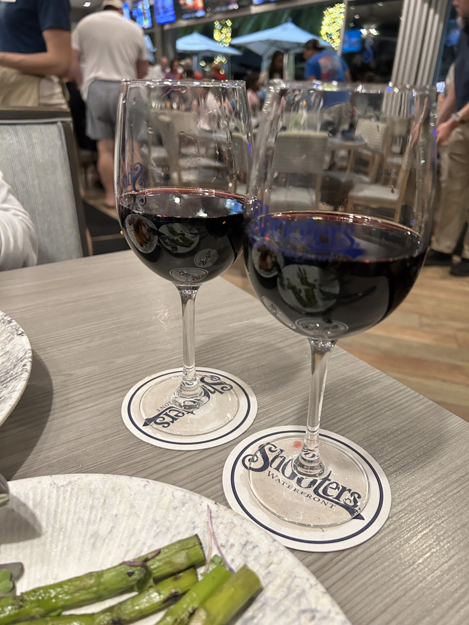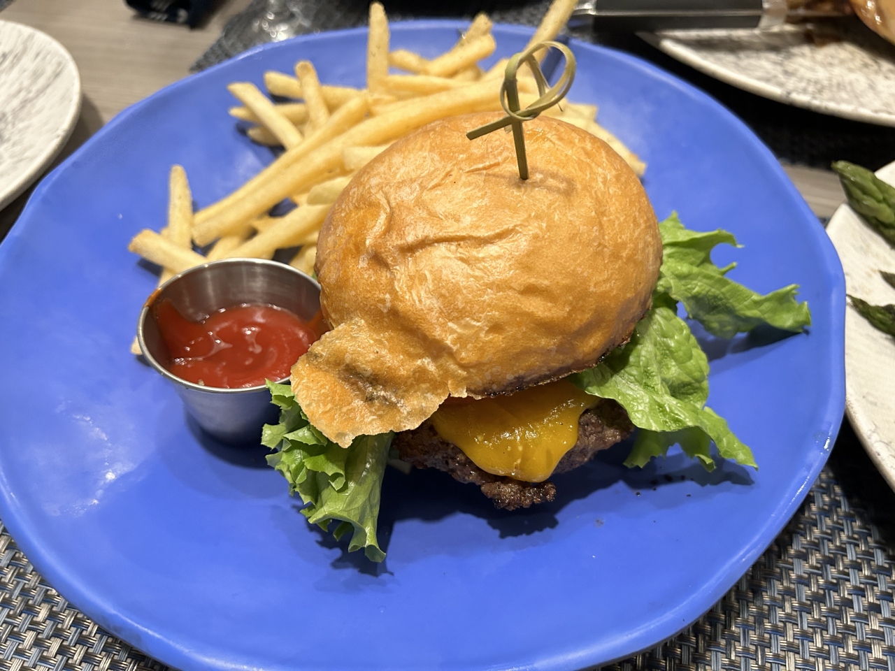 まずビールは、フォート・ローダーデールのクラフトビール醸造所「Funky Buddha」の白ビールと、マイアミの醸造所「Wynwood Brewing Company」のブロンド・エールがありましたのでそれぞれチョイス。アスパラガスのグリルをサイドに、私はチーズバーガー、妻はローストチキンをいただきました。赤ワインに切り替え、ワシントン州のカベルネ「ダーク・ハーベスト」をチョイス。