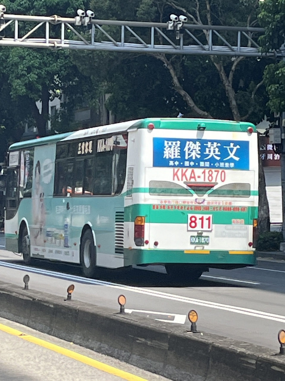 白地に緑色の線のバスは台北駅、板橋駅、松山空港などでもよく見かける。古いバスは後方に「歓迎搭乗 三重客運」と書いてある。