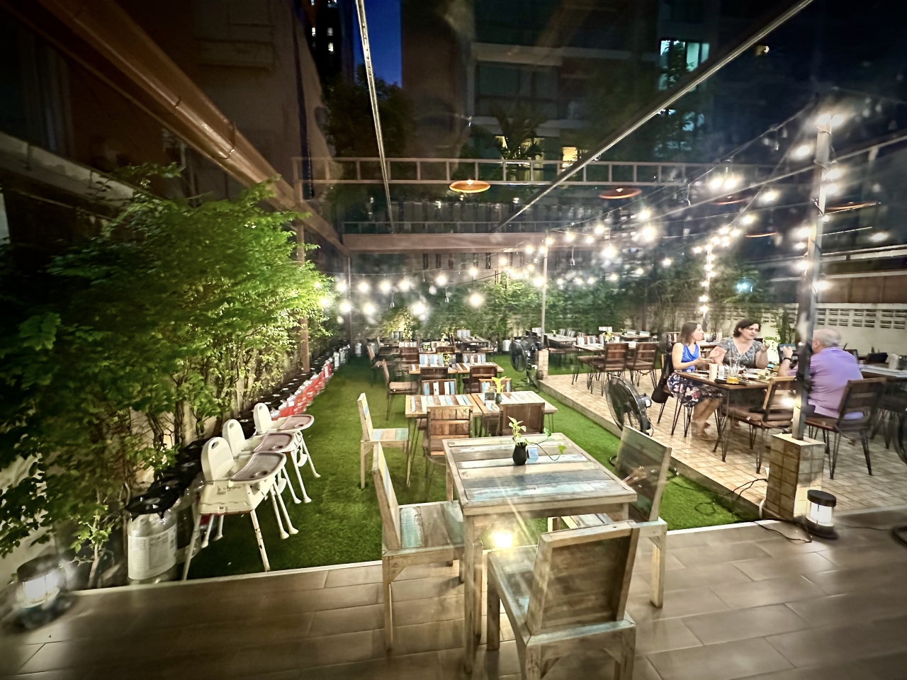 一階は小さな空間にテーブル席やソファ席があり、右側にはビアガーデンっぽい屋外テーブルがある(蒸し暑いので我々は冷房の効いた室内にした)。2階は貸切りの大部屋になっていた。