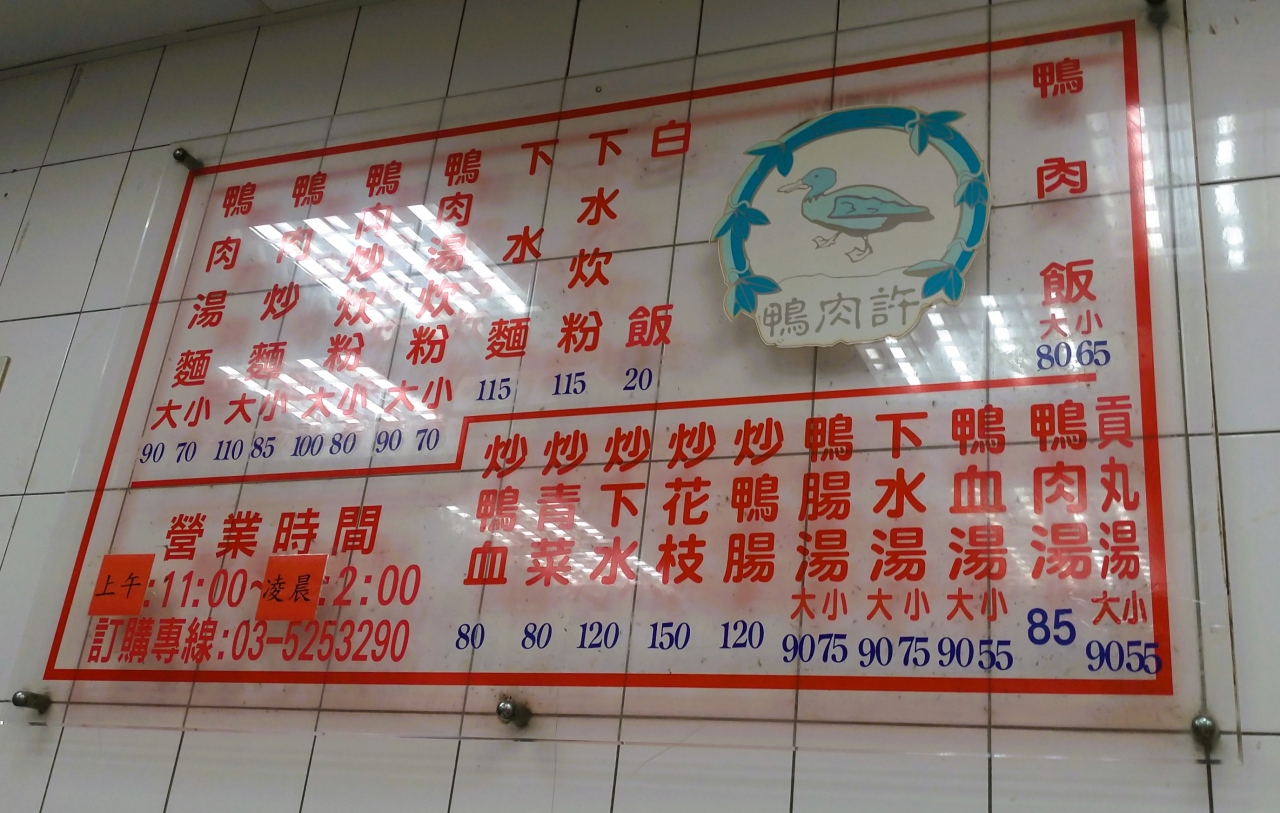 実際には、宿に置かれていた、日本語、中国語(繫)、英語の三か国語で作られたリーフレットがとても役に立った。かぎでもそうだったけれど、情報量がたっぷりで大変ありがたかった。相当な力作で、宿が作ったとは思えないのだけれど、だれが作ったのだろう。同じ内容が三か国語で作られているので、日本語であたりを付け、対応する英語と中国語の店名でgoogle検索をしていった。それはさておき、そこに書かれていた店が鴨肉許。リーフレットに書かれていた店名からgoogle mapで場所を探して、たどり着くことができた。