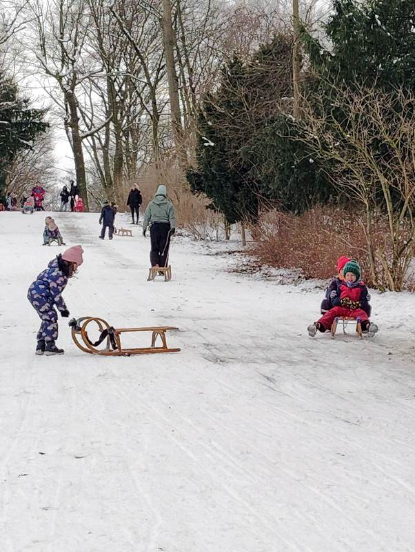 瓦礫の女(終戦直後男手のないなかでベルリンの復興を成し遂げた女性たち)の像と子供たちのソリ滑り