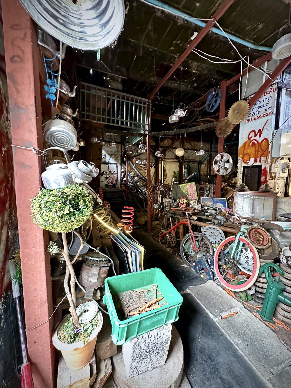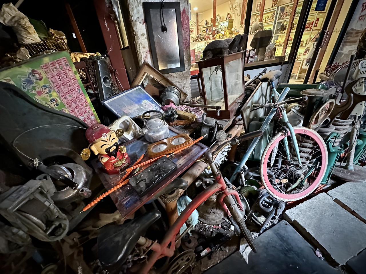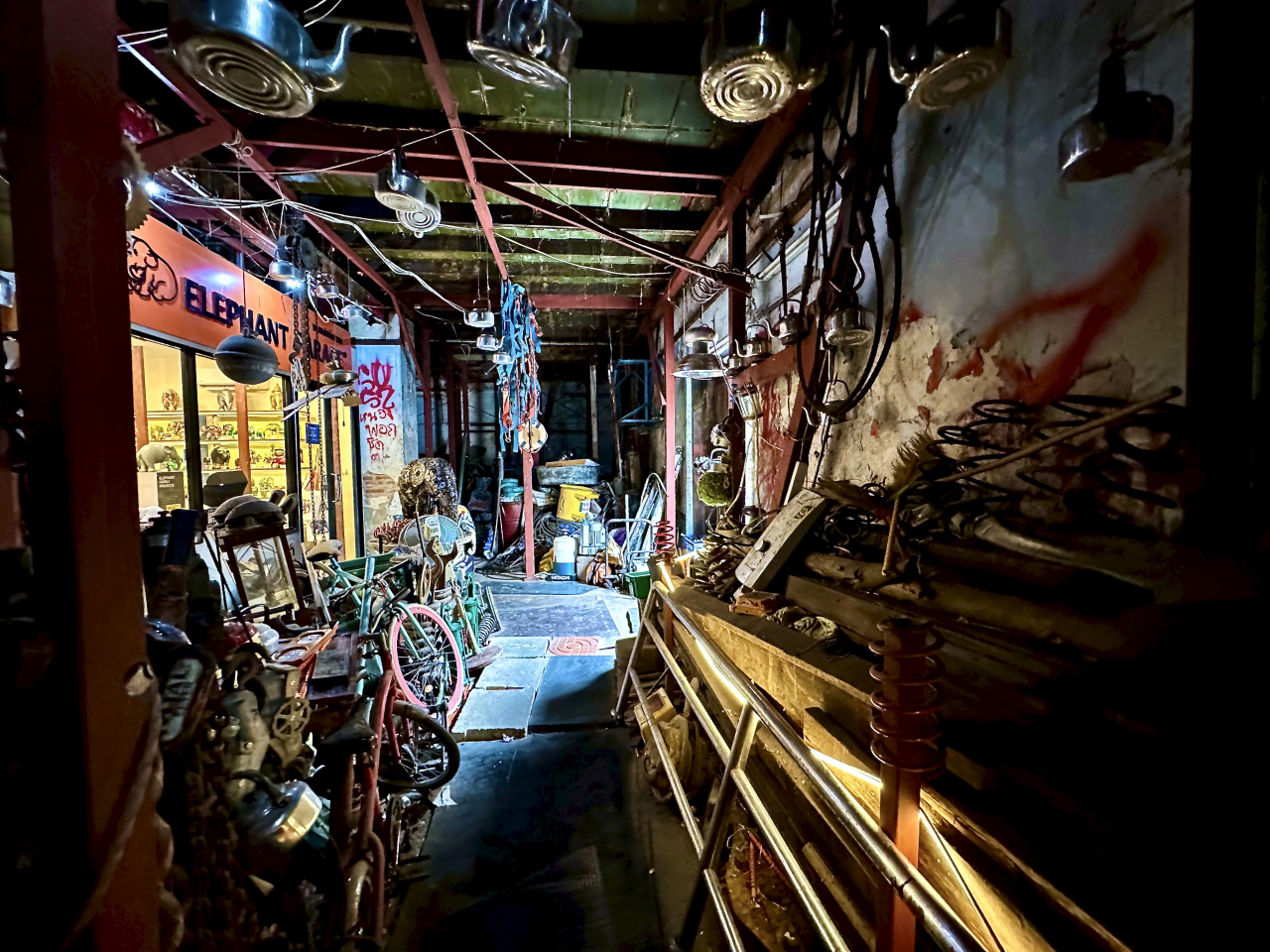 一階は、「小さな象さんの置物専門店」とその横は「車の廃棄部品が山積みにされた廃品置き場(多分、ここは以前、車やバイクの修理屋だったのかも…今はその廃棄物跡がアートの一部となっている)」になっており、