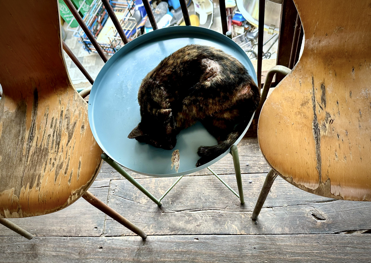 小さな木造りの階段をおっかなびっくり上がっていくと、飼い猫たち(人慣れした)が油断しまくりで寝そべっている。