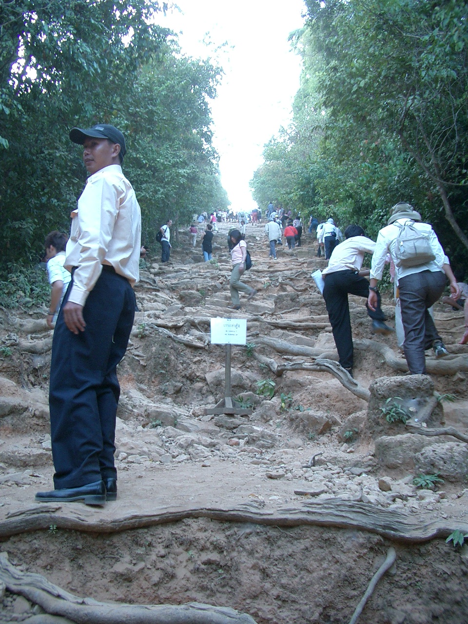 夕陽鑑賞の定番といわれるプノン・バケンの丘です。高さ60m、急で荒れた整っていない上り坂を一気に登ります。ほとんどの観光客はこの坂道を登るようですが、体力に自信のない人は象に乗って登ることができるみたいです。料金は登り$15(1人)で下りが$10(1人)とのことでした。日が落ちてからの下山は危険なので注意しましょう。