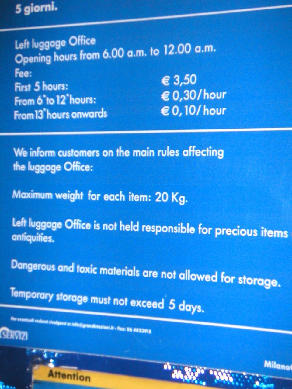 ミラノ中央駅の手荷物預かり所で詳細をチェックしてきたので、よろしければお役立てください。