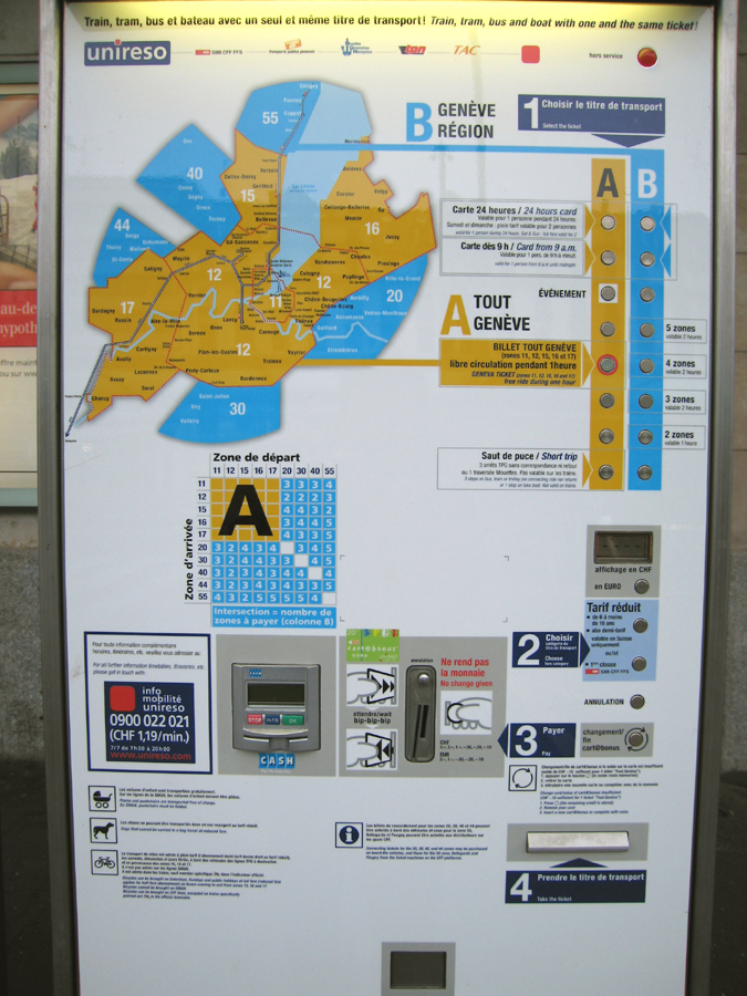 自動販売機は、黄色のゾーン(普通の観光客の移動範囲内)の1時間乗り放題が3フラン。