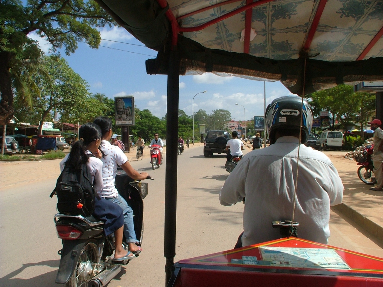 バイクの後にツーシーターの座席を付けた「トゥクトゥク」。ホテル前にタムロしているのは観光客をナメテかかる。旧市内はだいたい4000R($1)の相場だが、彼らは$5からのディスカウント交渉(日本語で「何ドル?」)をしてくるので、「4000R」と突っぱね、少々歩きましょう。するとほとんどはそれで良いと言う。言ってこなかったら空車のトゥクトゥクを止めれば4000Rで乗れます。交渉はリエルでしましょう。4000、4500、5000というようにこちらが主導権を取りましょう、ドルで交渉すると1$の次は2$になりますからね。